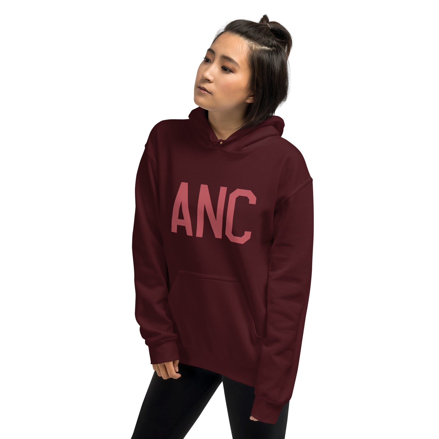 Experience ultimate comfort and local pride with our hoodie featuring Anchorage, Alaska's ANC (Ted Stevens) airport code. The design is inspired by the lettering used by the Air Force for aircraft registration numbers. The graphic, presented in understated deep pink, captures the very essence of flight.