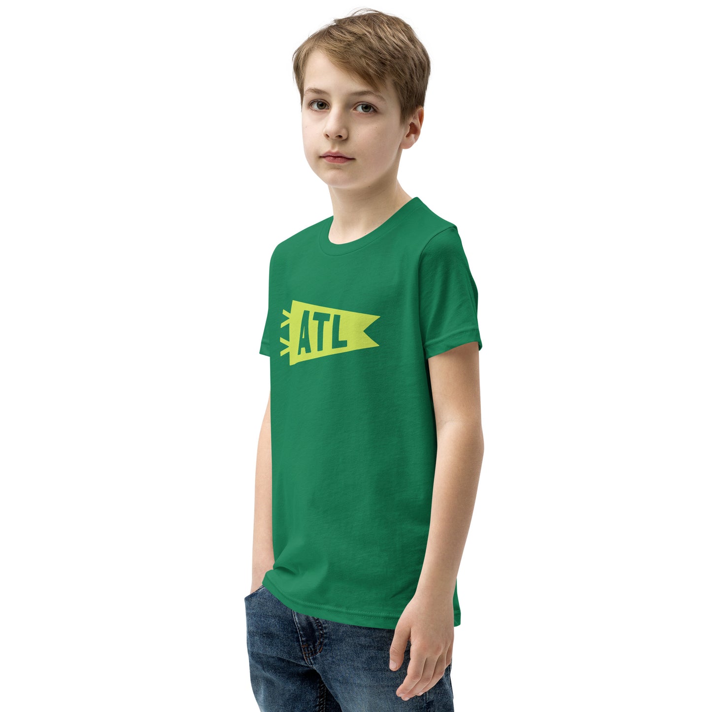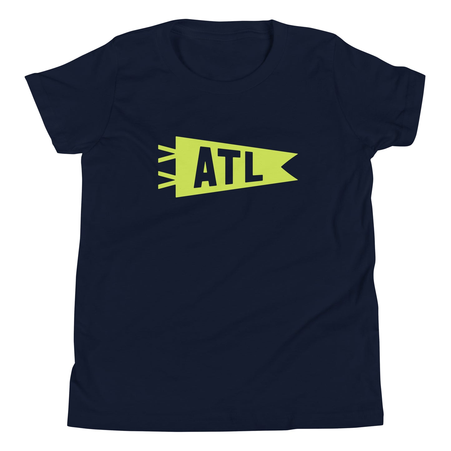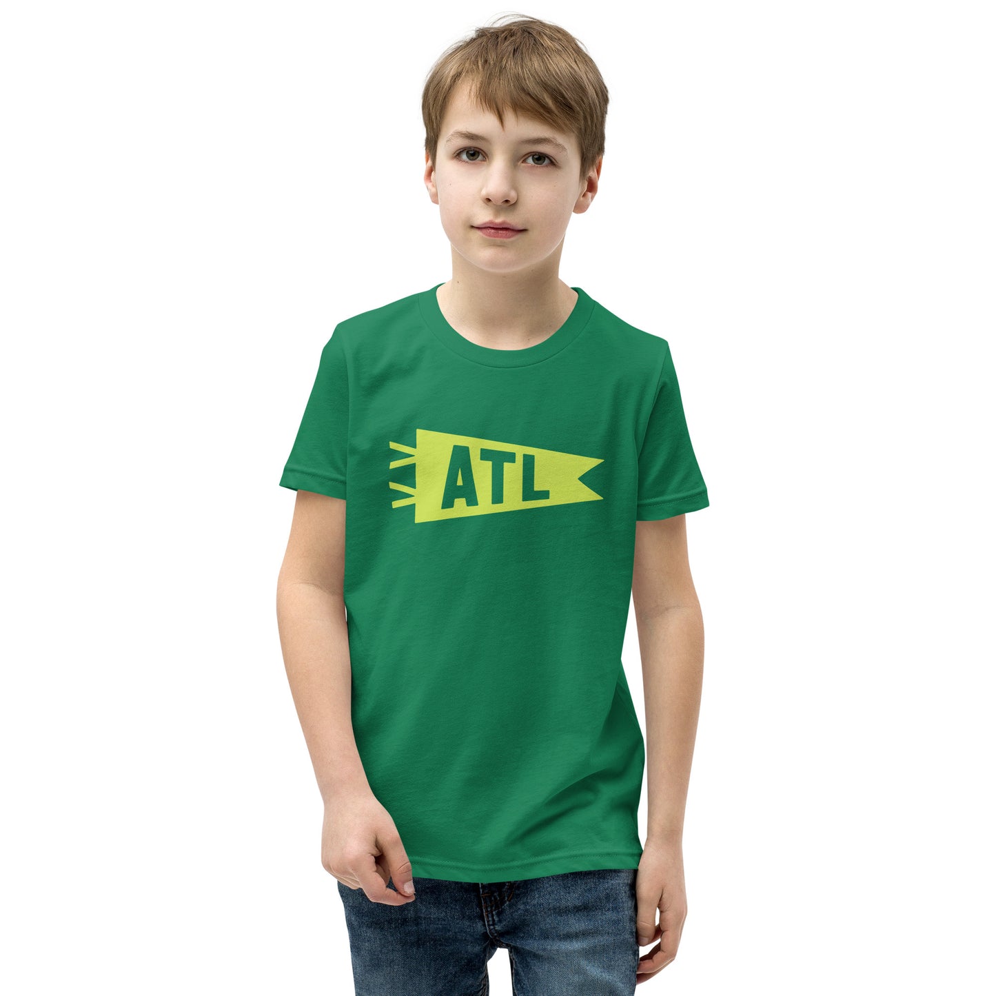Equip your young adventurer with this kid's t-shirt featuring Atlanta, Georgia's ATL (Hartsfield-Jackson) airport code in a vibrant minimalist banner design. Printed in eye-catching bright green, this tee is more than just apparel—it's a symbol of local pride, community spirit, and a burgeoning passion for travel.