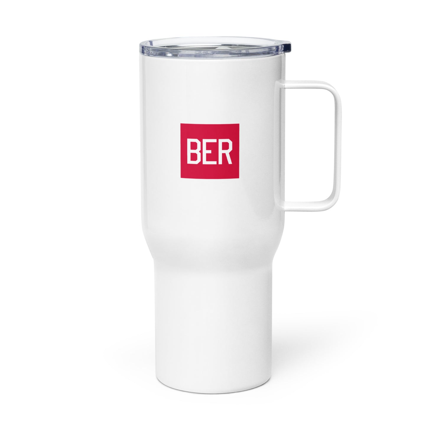 Get this travel mug featuring Berlin, Germany's BER (Brandenburg) airport code in lettering reminiscent of Air Force registration numbers, adding an aviation-inspired touch with every sip. The design is printed in eye-catching crimson red on both sides creating a minimalist and functional aesthetic. Whether you're at home, in the office, or on the go, this mug allows you to proudly represent your hometown, favourite city, or dream travel destination.