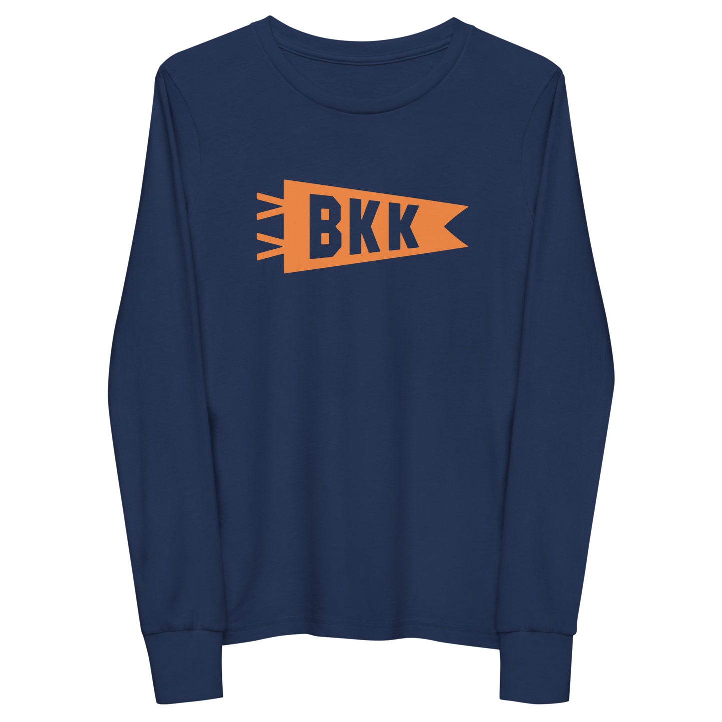 Equip your young adventurer with this kid's long-sleeve t-shirt featuring Bangkok, Thailand's BKK (Suvarnabhumi) airport code in a vibrant minimalist banner design. Printed in vivid orange, this tee is more than just apparel—it's a symbol of local pride, community spirit, and a burgeoning passion for travel.