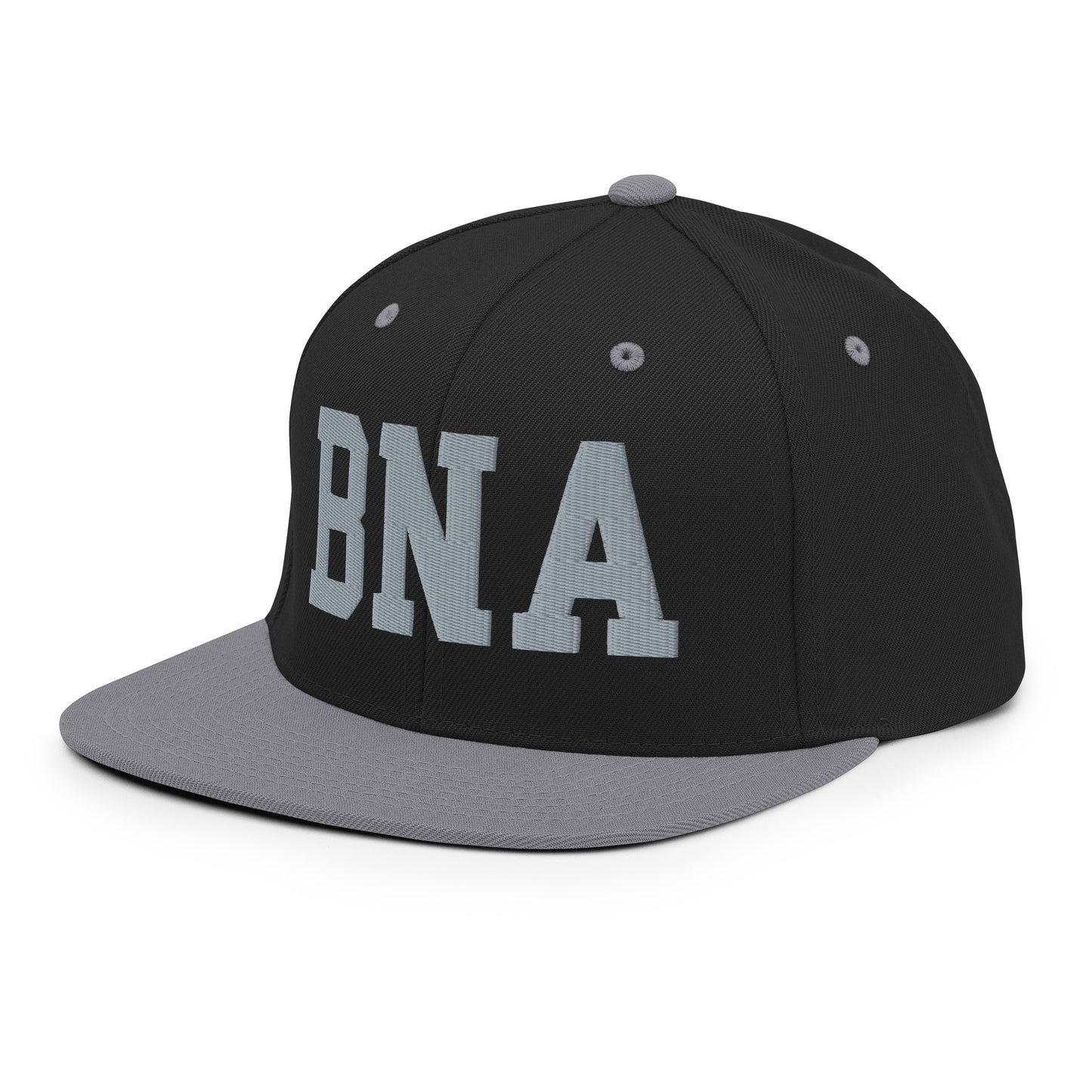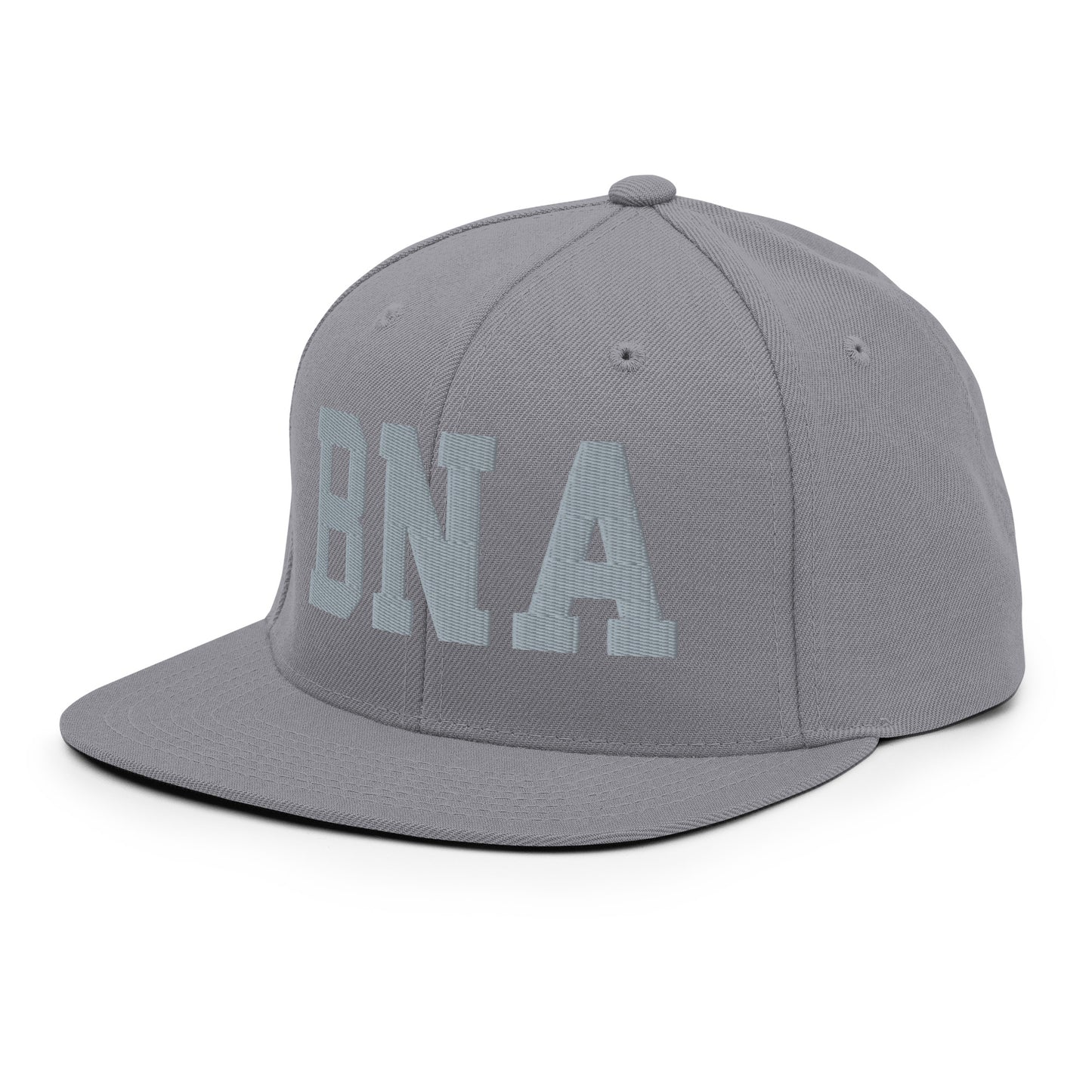 Elevate your streetwear with our snapback hat featuring Nashville, Tennessee's BNA airport code, boldly embroidered in vintage college-style lettering. This throwback varsity-inspired design adds a timeless edge to any outfit, with embroidery in grey perfectly complementing the hat's various colours. The structured build, flat brim, and full buckram help maintain its classic shape, offering both durability and style.