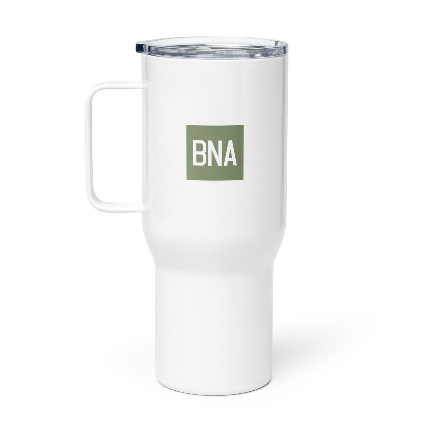 Get this travel mug featuring Nashville, Tennessee's BNA airport code in lettering reminiscent of Air Force registration numbers, adding an aviation-inspired touch with every sip. The design is printed in subdued camouflage green on both sides creating a minimalist and functional aesthetic. Whether you're at home, in the office, or on the go, this mug allows you to proudly represent your hometown, favourite city, or dream travel destination.
