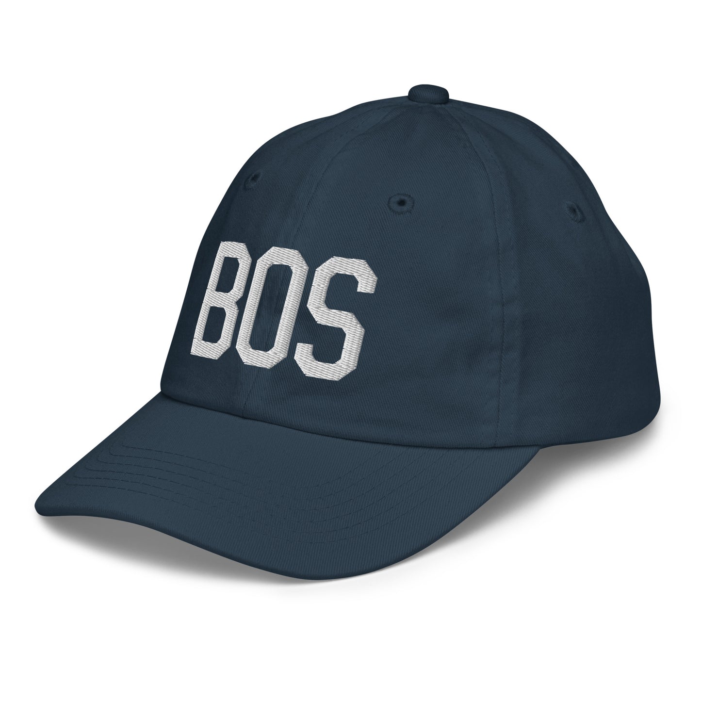 Elevate your child's style and imagination with our kid's baseball cap featuring Boston, Massachusetts's BOS (Logan) airport code, intricately embroidered in classic white thread. Drawing inspiration from the aircraft registration lettering of the Air Force, the design captures the essence of aviation, making this cap a symbol of timeless flight.