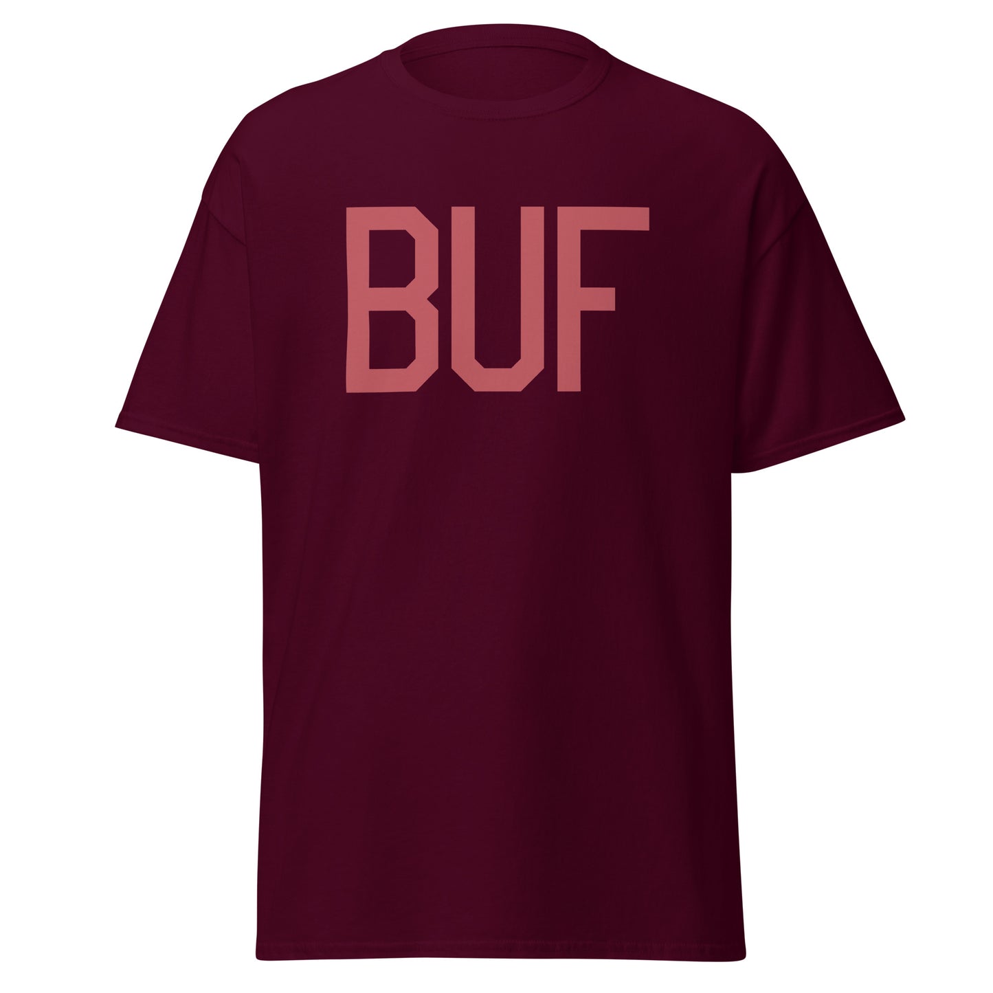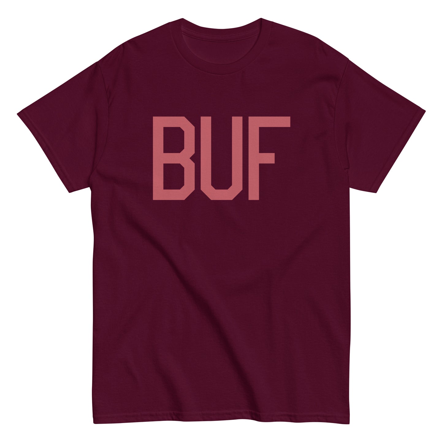 Celebrate your passion for aviation with our classic men's t-shirt featuring Buffalo, New York's BUF (Buffalo-Niagara) airport code. Embodied with the spirit of flight, this tee showcases the city's iconic airport code in captivating Air Force aircraft registration-inspired lettering in understated deep pink.