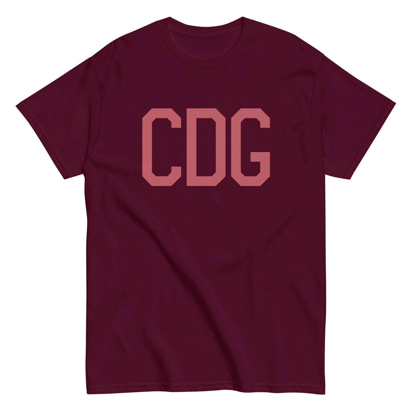 Celebrate your passion for aviation with our classic men's t-shirt featuring Paris, France's CDG (Charles de Gaulle) airport code. Embodied with the spirit of flight, this tee showcases the city's iconic airport code in captivating Air Force aircraft registration-inspired lettering in understated deep pink.