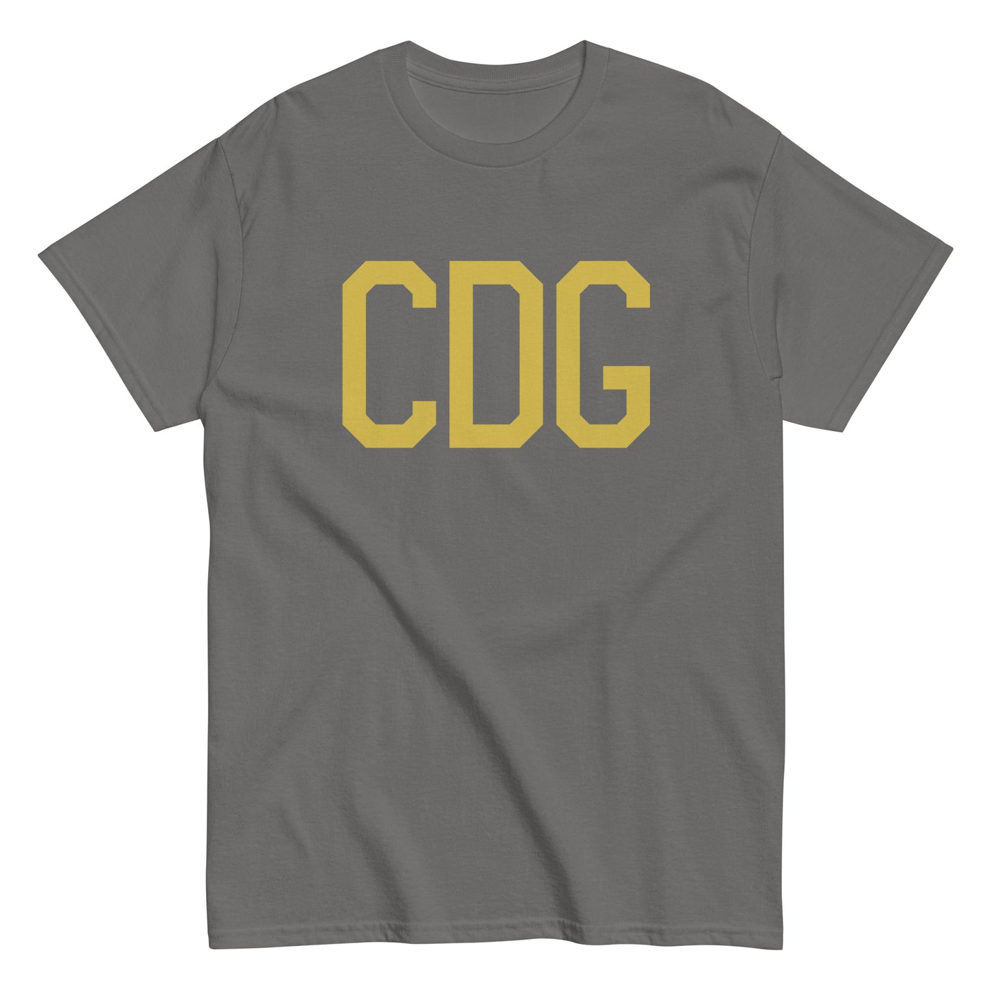 Celebrate your passion for aviation with our classic men's t-shirt featuring Paris, France's CDG (Charles de Gaulle) airport code. Embodied with the spirit of flight, this tee showcases the city's iconic airport code in captivating Air Force aircraft registration-inspired lettering in refined old gold.