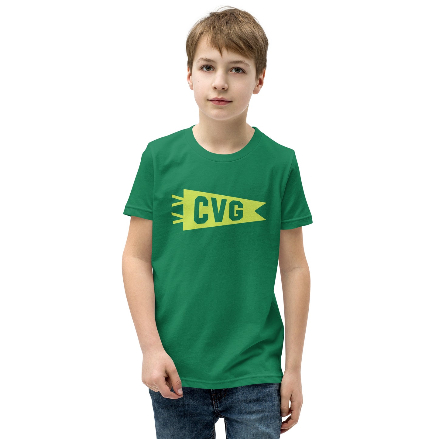 Equip your young adventurer with this kid's t-shirt featuring Cincinnati, Ohio's CVG airport code in a vibrant minimalist banner design. Printed in eye-catching bright green, this tee is more than just apparel—it's a symbol of local pride, community spirit, and a burgeoning passion for travel.