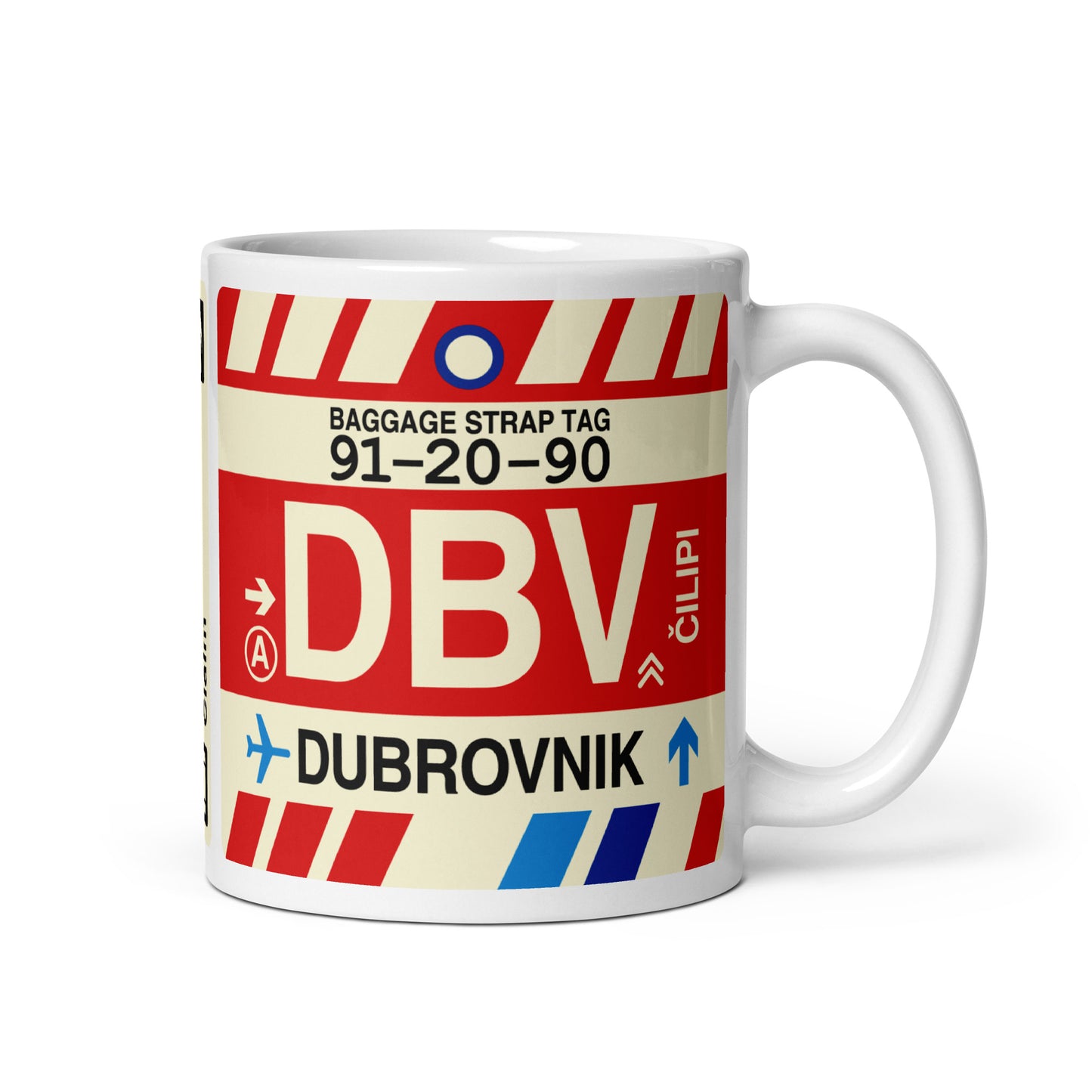Immerse yourself in nostalgic elegance with our coffee mug featuring Dubrovnik, Croatia's DBV (?ilipi) airport code. This remarkable design transports you to an era of sophistication and adventure, evoking the allure of vintage baggage tags that once adorned travel luggage. Relive the golden age of air travel, where the promise of each journey was imbued with glamour and excitement. With the artwork printed on both sides, the colours take inspiration from iconic airline liveries, infusing every mug with an air of authenticity.
