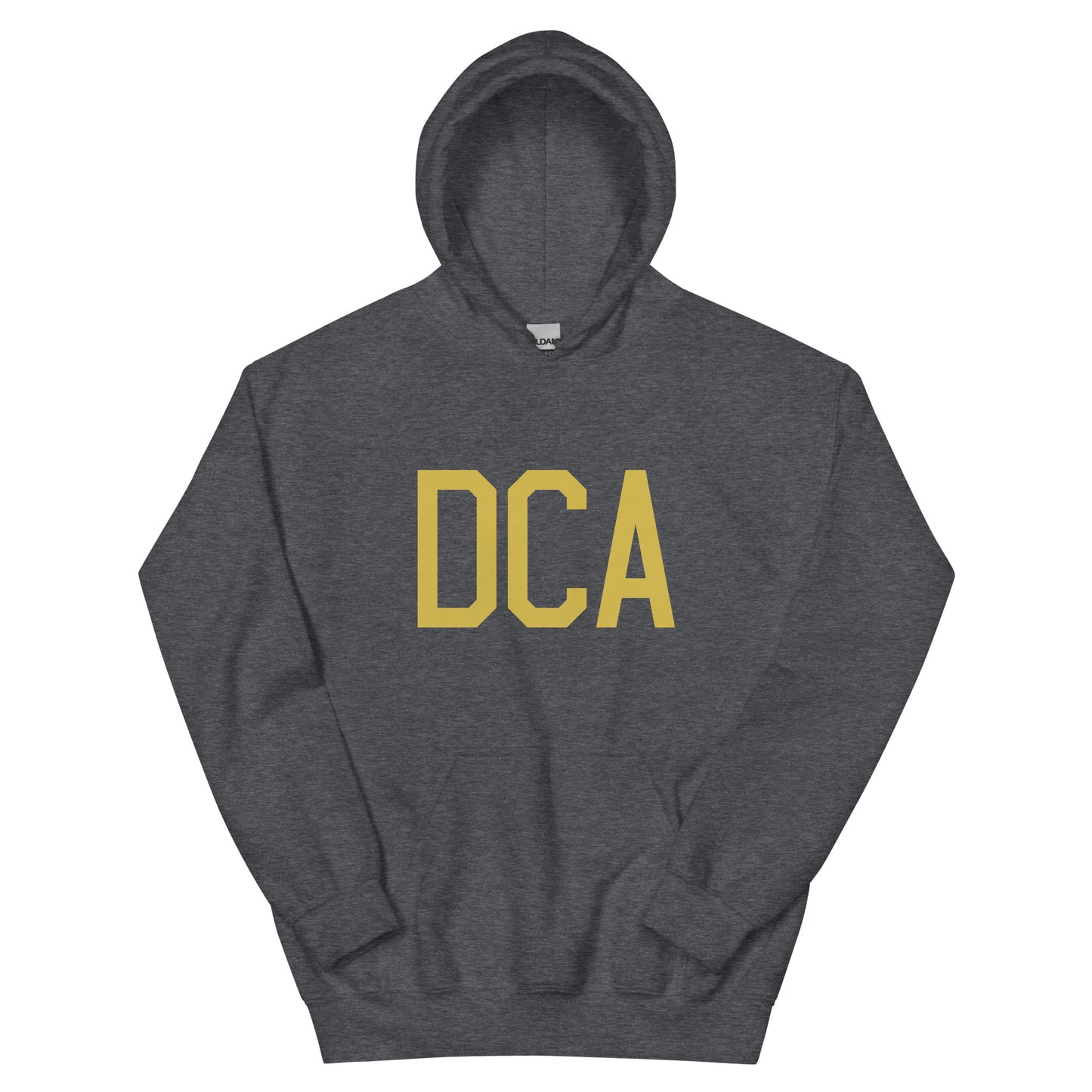 Experience ultimate comfort and local pride with our hoodie featuring Washington, D.C.'s DCA (Reagan National) airport code. The design is inspired by the lettering used by the Air Force for aircraft registration numbers. The graphic, presented in refined old gold, captures the very essence of flight.