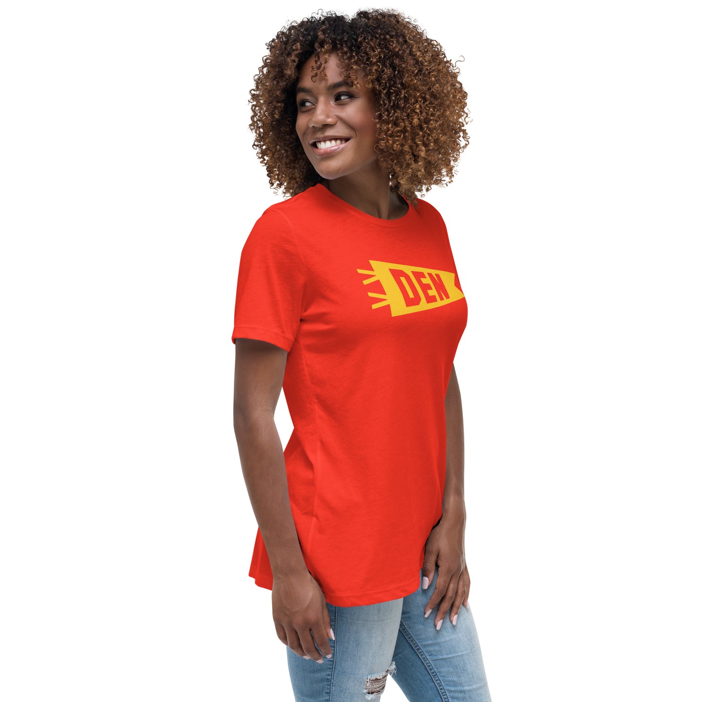 Elevate your look with this women's relaxed t-shirt featuring Denver, Colorado's DEN airport code in a vivid yellow minimalist banner design. Beyond style, it embodies local pride and community spirit, making it more than just a shirt—it's a statement.