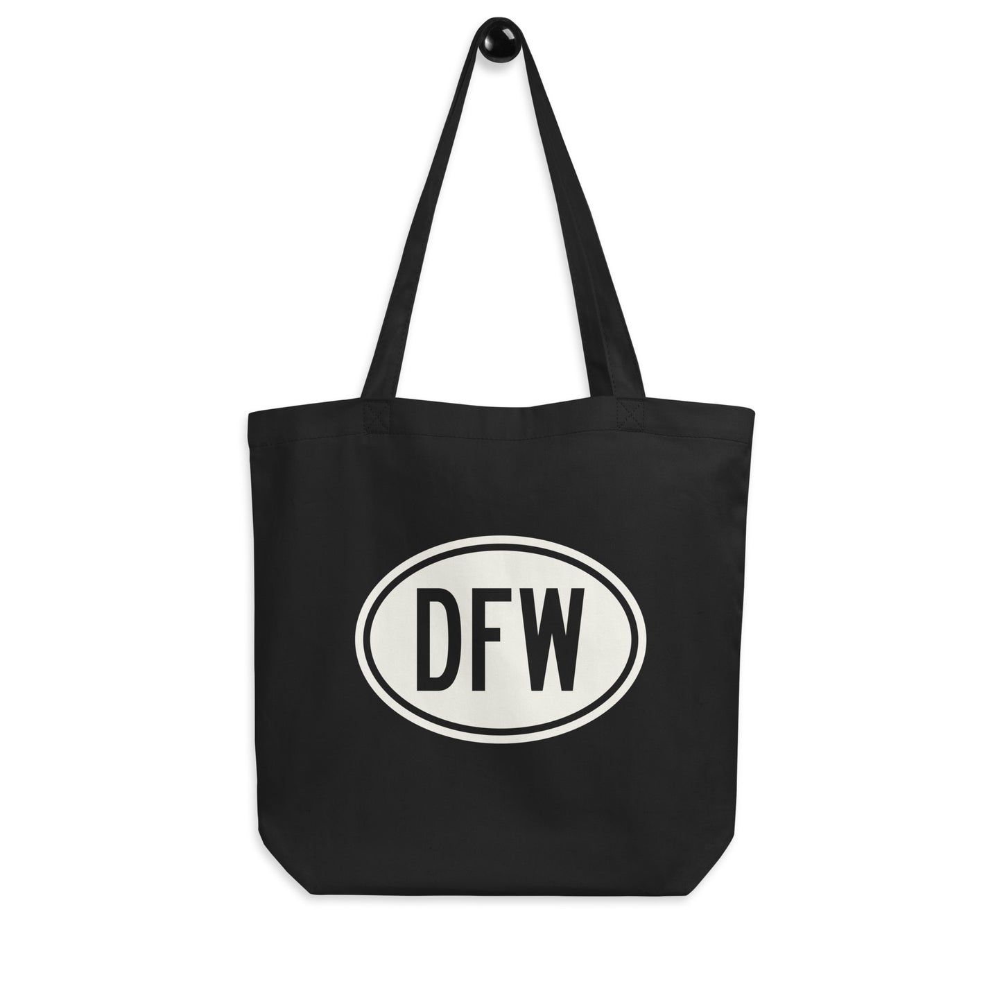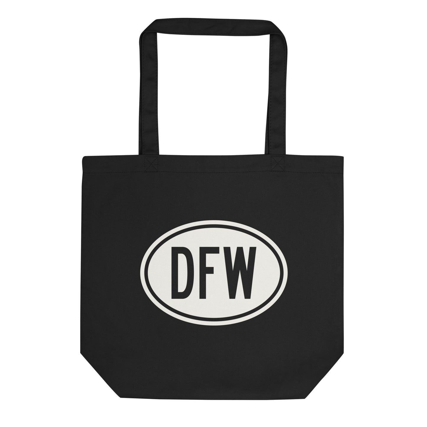Elevate your daily routine with our organic cotton tote bag featuring Dallas, Texas's DFW airport code — in a stylish nod to the classic oval car sticker once used to indicate a vehicle's country of registration. This design has evolved into an easily-recognizable cultural symbol of travel. It is elegantly printed in white on this black bag which serves as a bold backdrop.