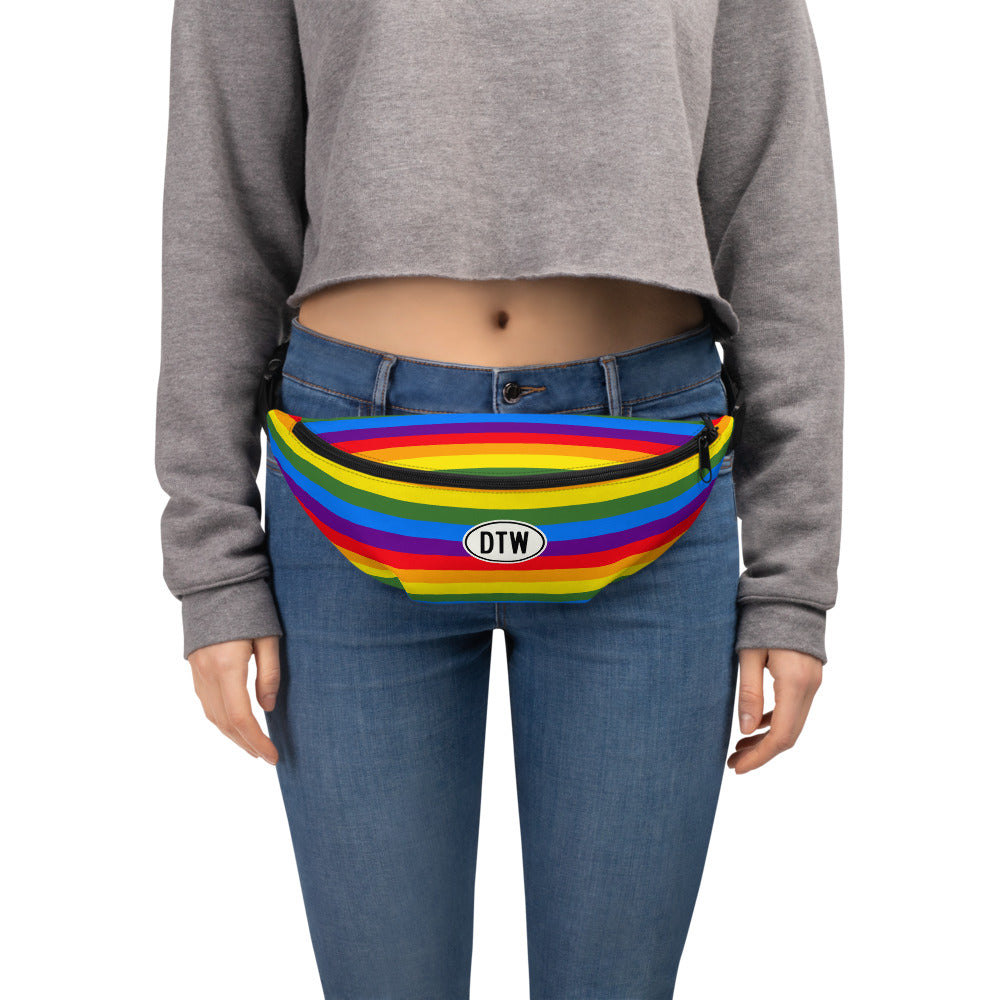 Refresh your on-the-go style with this fanny pack featuring Detroit, Michigan's DTW (Metropolitan) airport code. Inspired by vintage oval car stickers once affixed to vehicles to show their country of registration, this design captures the essence of travel culture against a vibrant rainbow-coloured horizontal striped background.