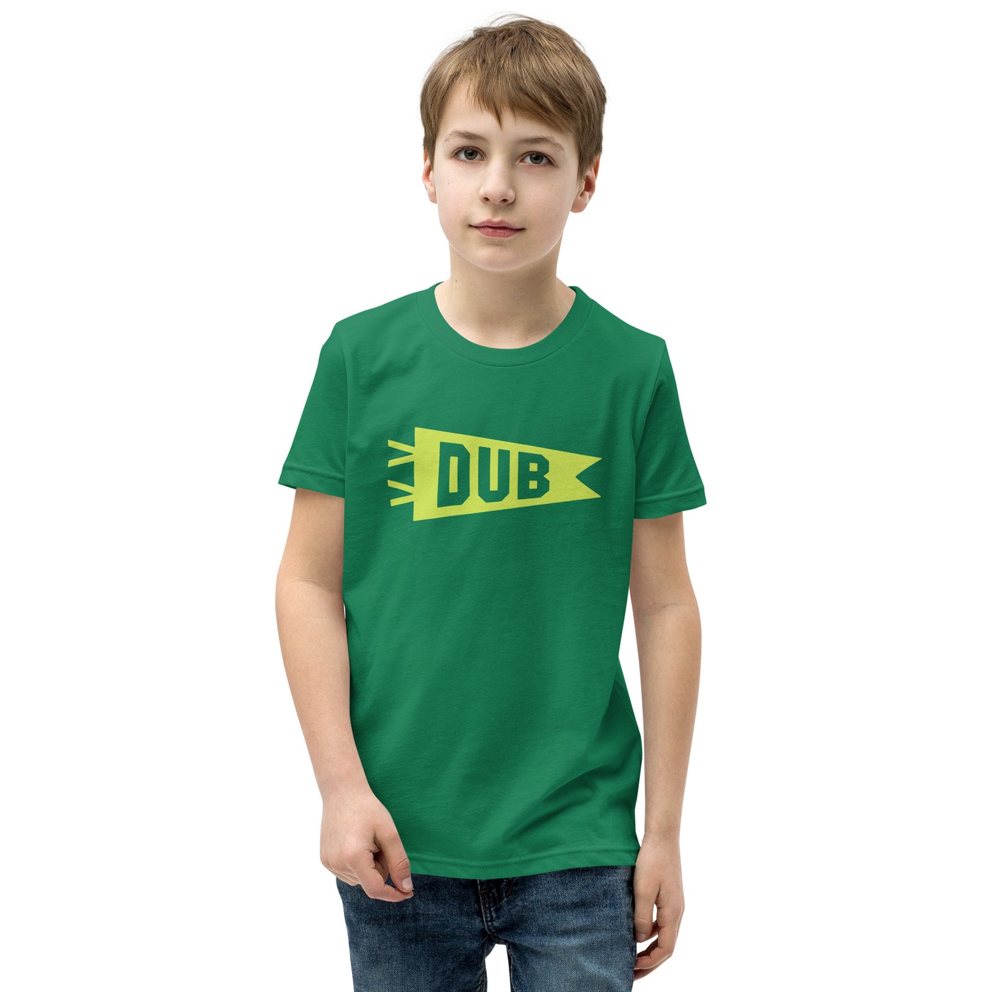 Equip your young adventurer with this kid's t-shirt featuring Dublin, Ireland's DUB airport code in a vibrant minimalist banner design. Printed in eye-catching bright green, this tee is more than just apparel—it's a symbol of local pride, community spirit, and a burgeoning passion for travel.
