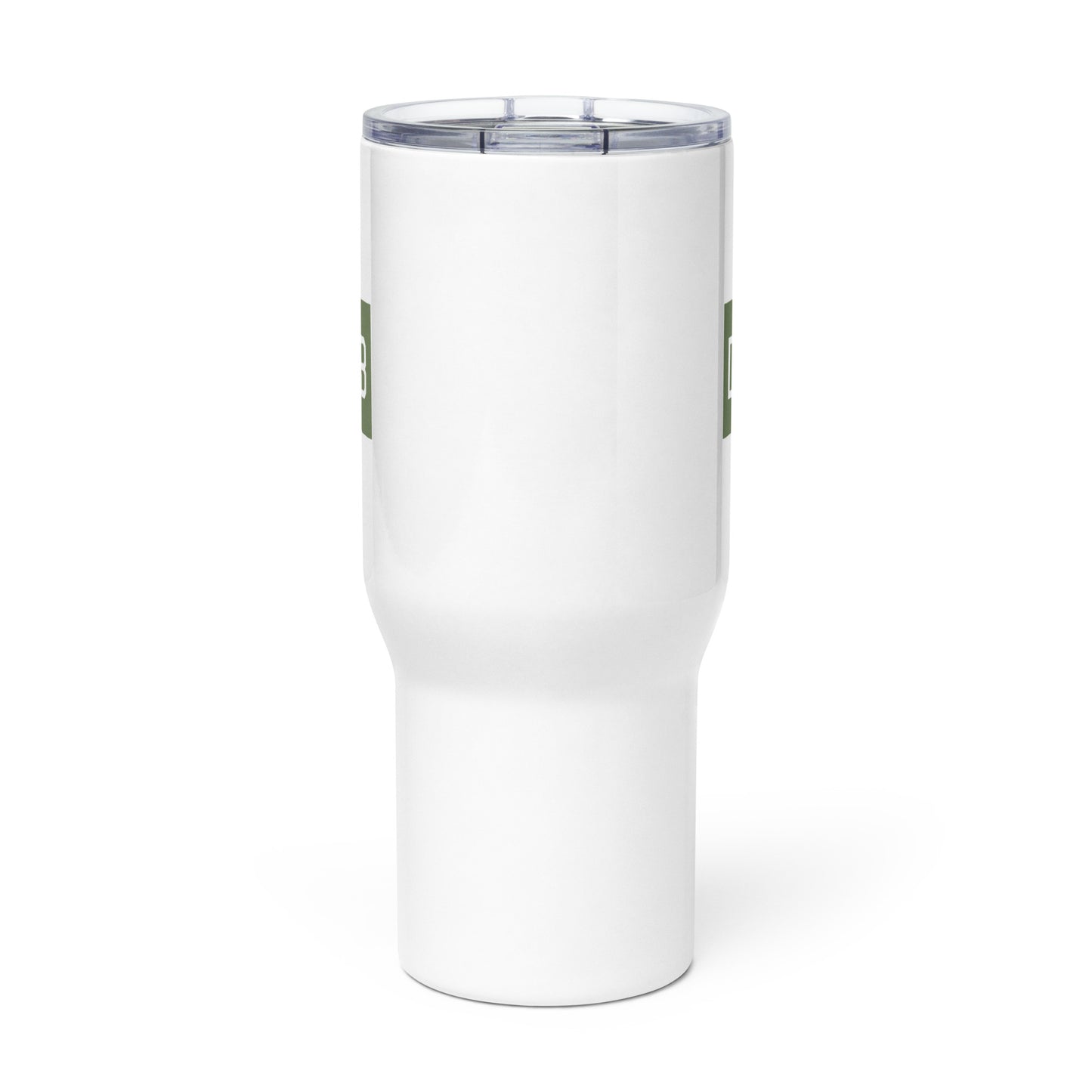 Get this travel mug featuring Dublin, Ireland's DUB airport code in lettering reminiscent of Air Force registration numbers, adding an aviation-inspired touch with every sip. The design is printed in subdued camouflage green on both sides creating a minimalist and functional aesthetic. Whether you're at home, in the office, or on the go, this mug allows you to proudly represent your hometown, favourite city, or dream travel destination.