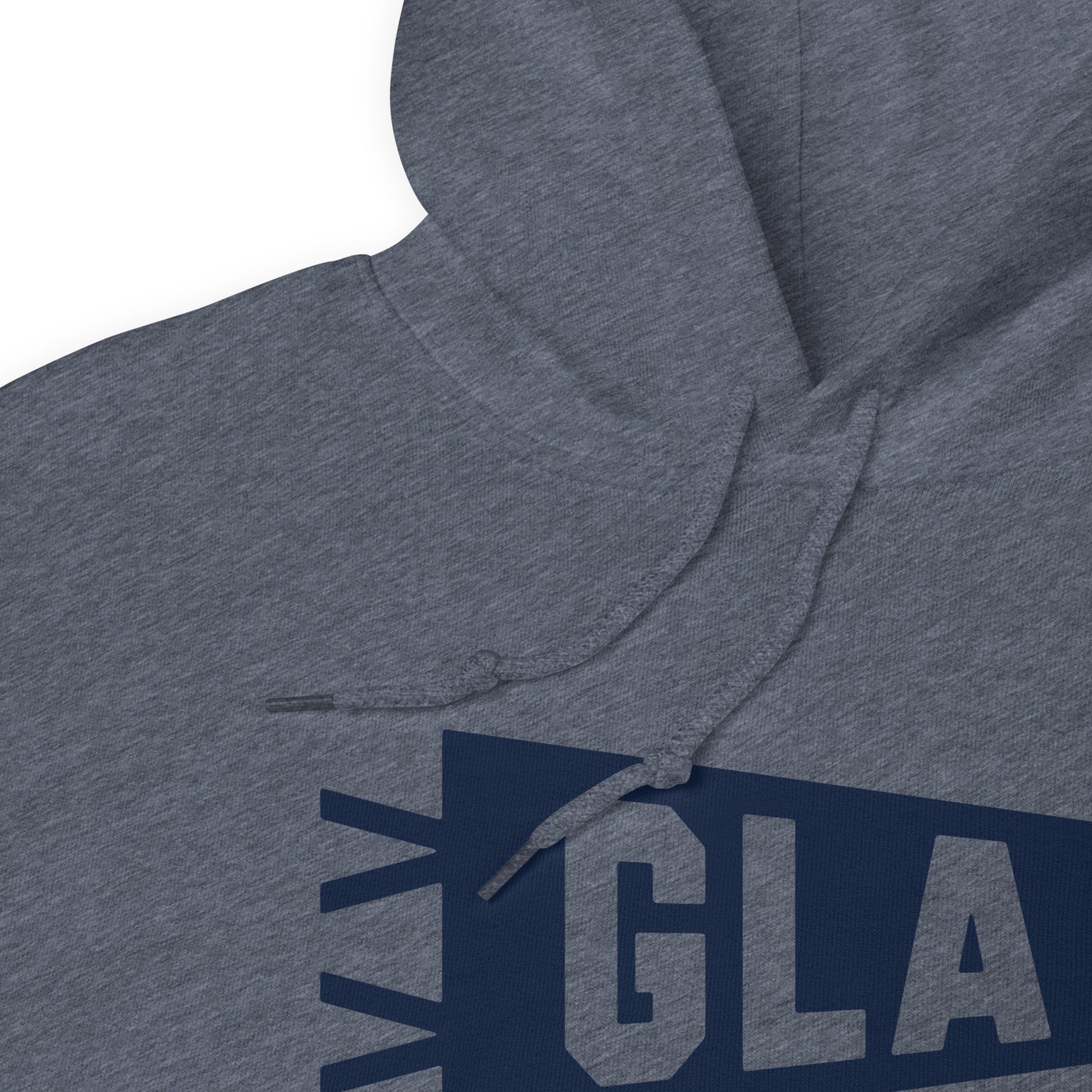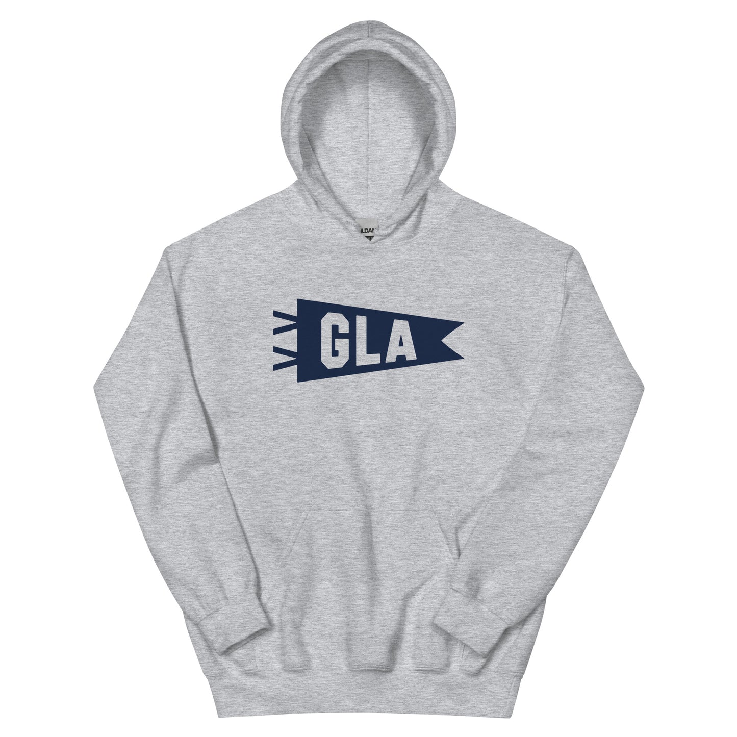 Embrace the perfect blend of comfort and pride with our unisex hoodie featuring Glasgow, Scotland's GLA airport code in a minimalist banner design printed in refined navy blue. Proudly represent your hometown or beloved city as you explore the urban landscape.
