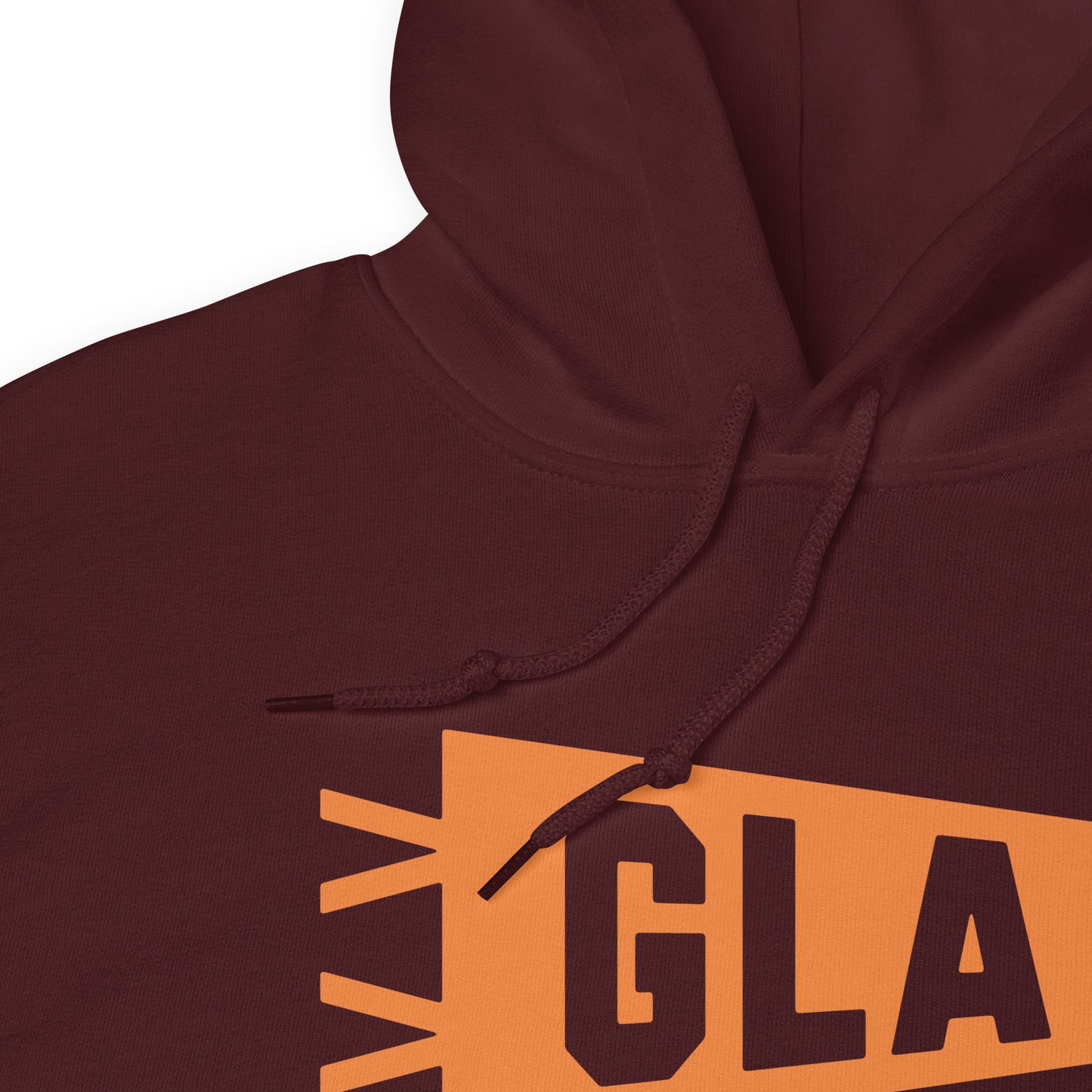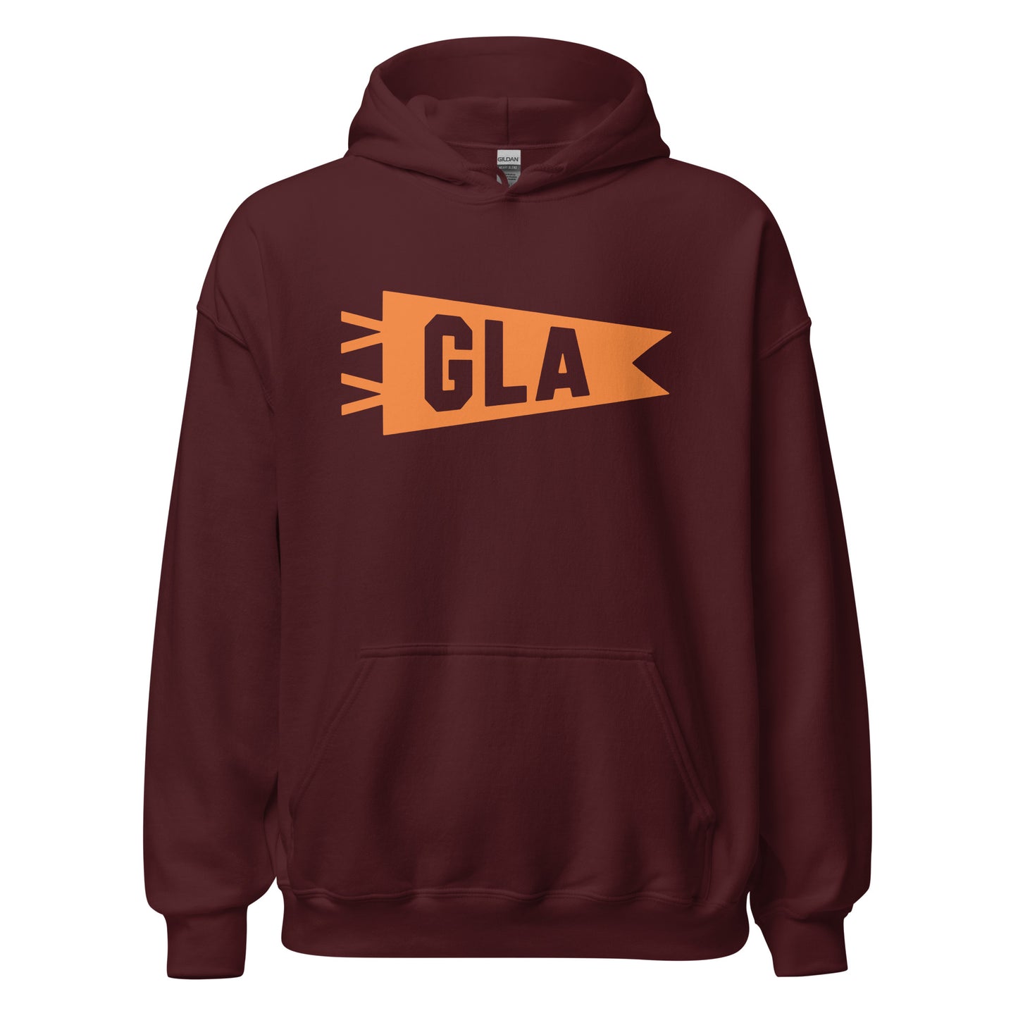 Embrace the perfect blend of comfort and pride with our unisex hoodie featuring Glasgow, Scotland's GLA airport code in a minimalist banner design printed in vivid orange. Proudly represent your hometown or beloved city as you explore the urban landscape.