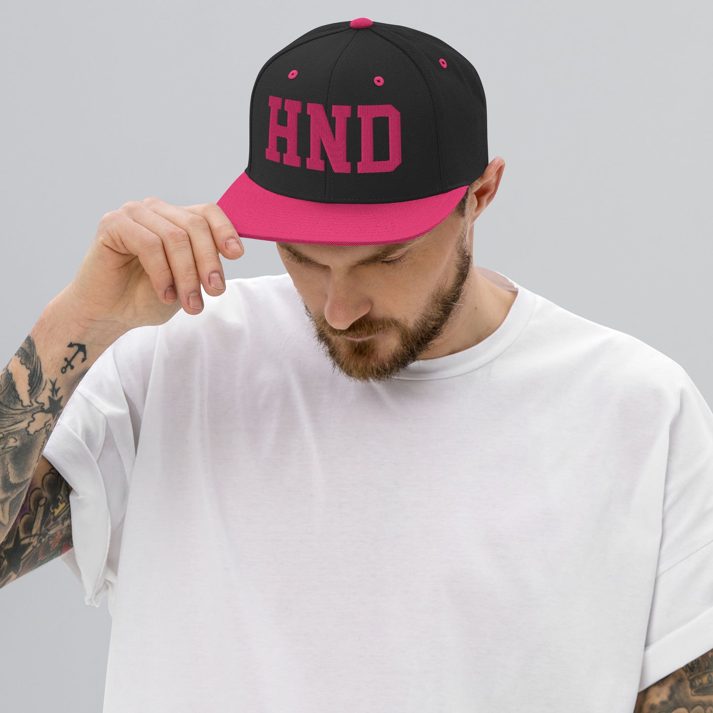 Elevate your streetwear with our black and pink snapback hat featuring Tokyo, Japan's HND (Haneda) airport code, boldly embroidered in vintage college-style lettering. This throwback varsity-inspired design adds a timeless edge to any outfit, with pink embroidery perfectly complementing the hat's sleek black and pink colours. The structured build, flat brim, and full buckram help maintain its classic shape, offering both durability and style.