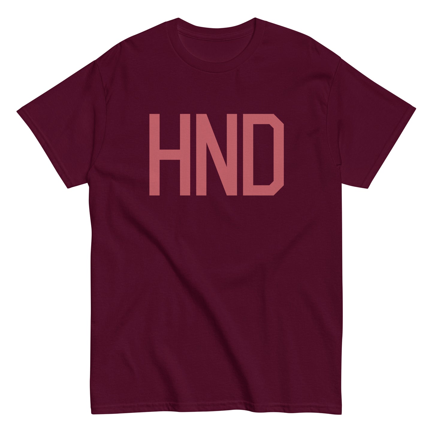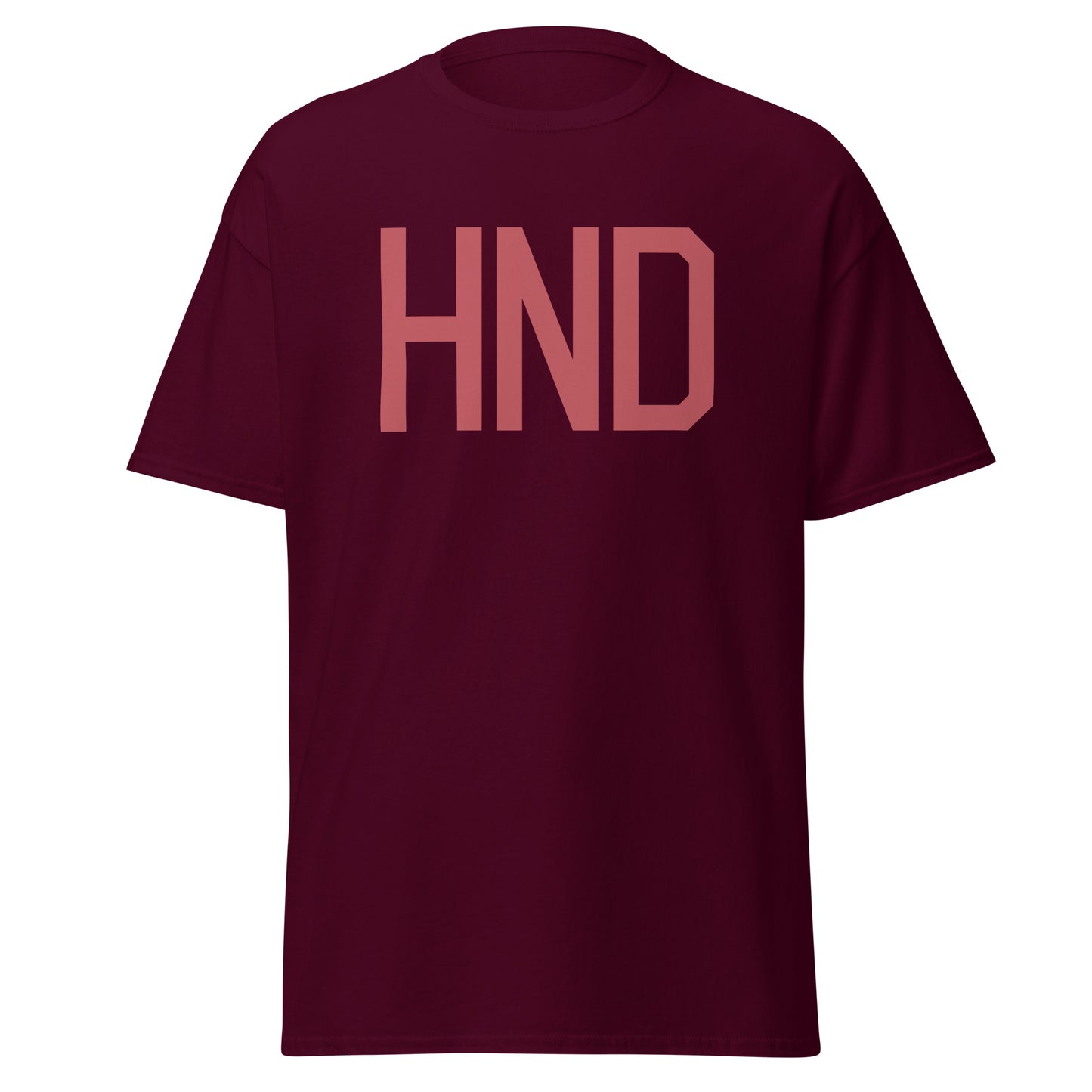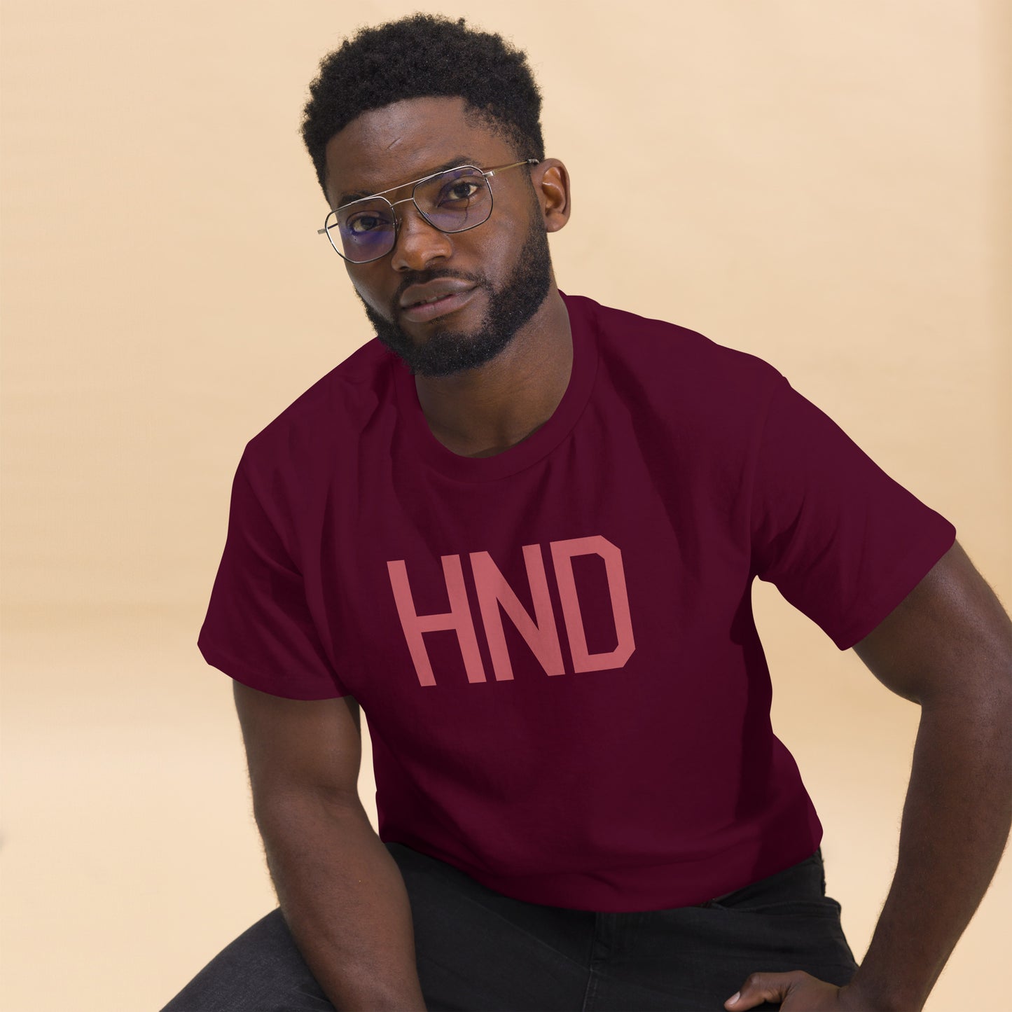 Celebrate your passion for aviation with our classic men's t-shirt featuring Tokyo, Japan's HND (Haneda) airport code. Embodied with the spirit of flight, this tee showcases the city's iconic airport code in captivating Air Force aircraft registration-inspired lettering in understated deep pink.