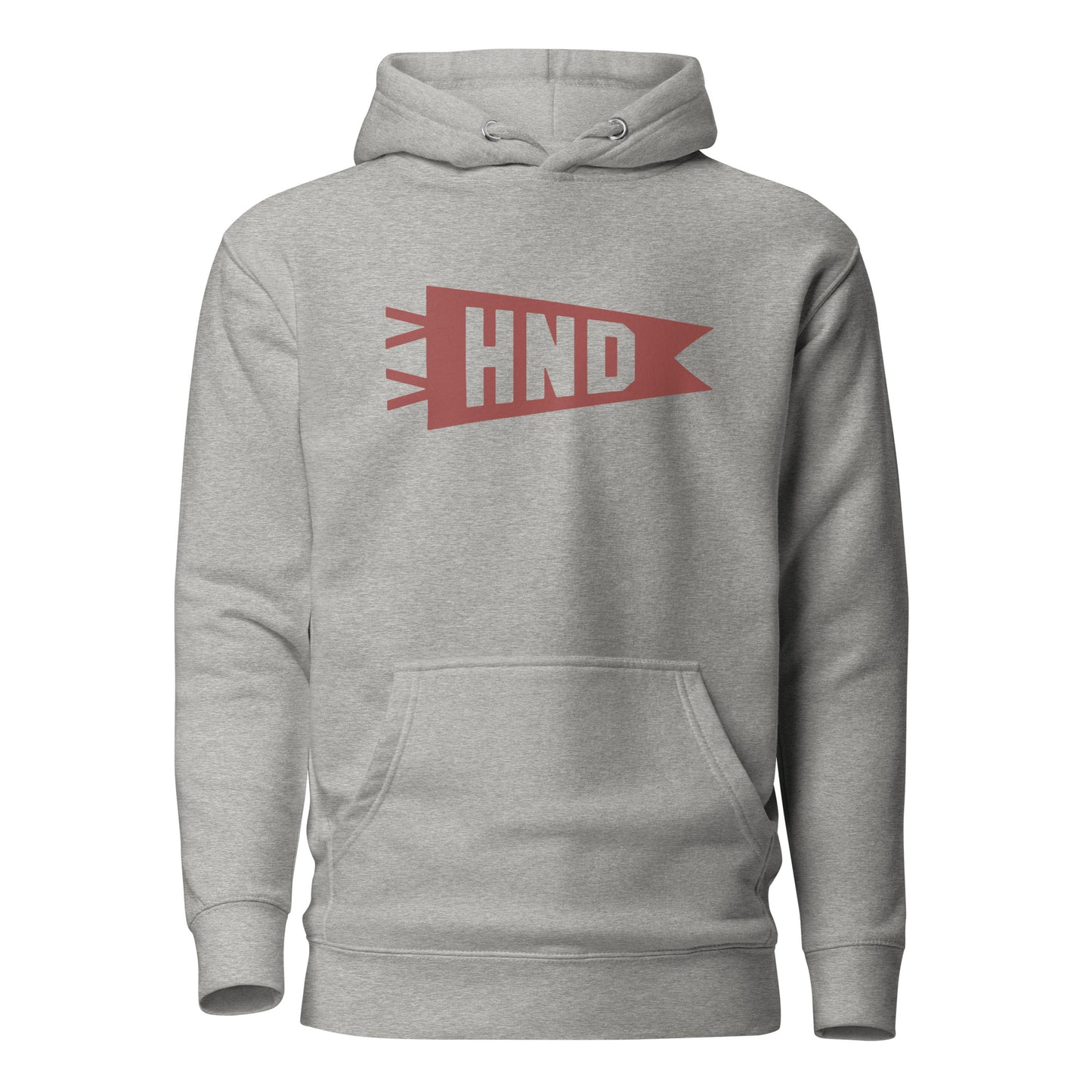 Discover this premium hoodie featuring Tokyo, Japan's HND (Haneda) airport code in a minimalist banner design printed in earthy terracotta red. Proudly represent your hometown or beloved city as you explore the urban landscape.