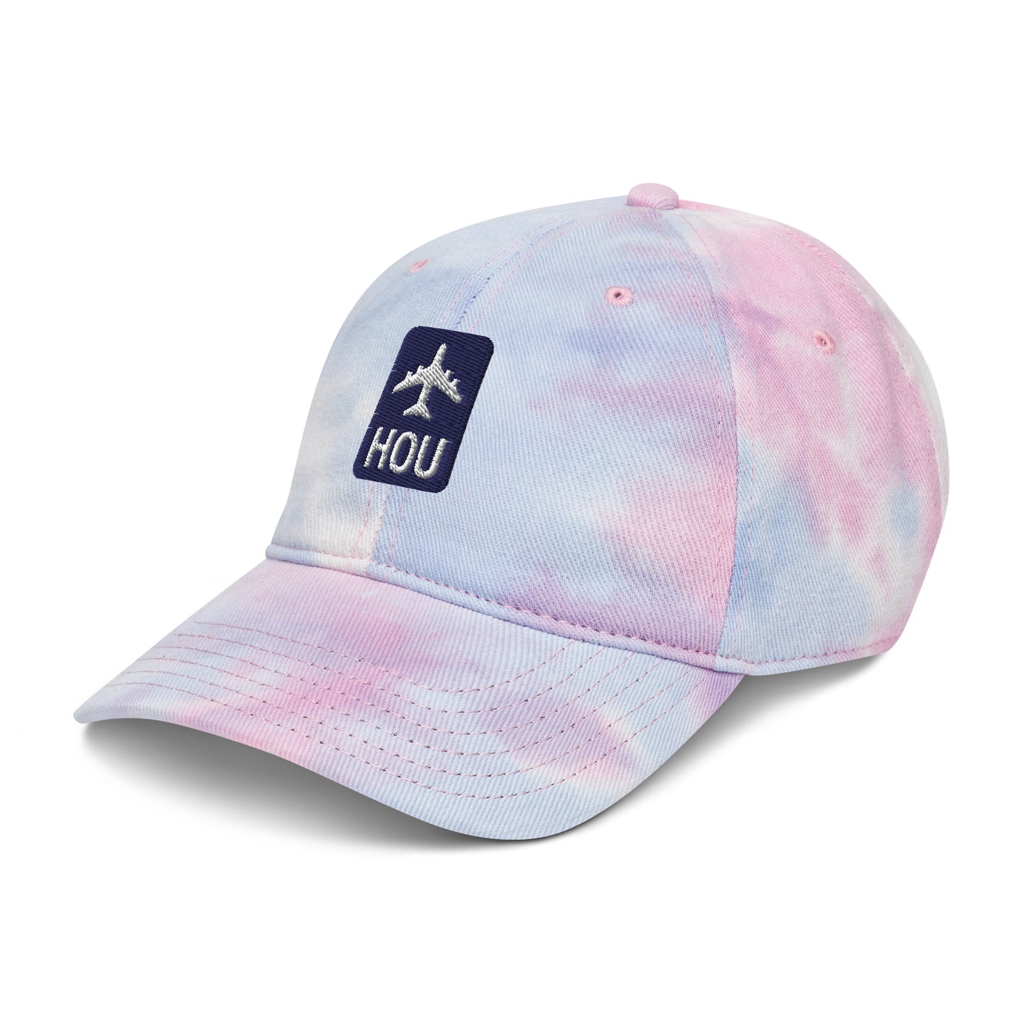 Add a splash of creativity to your wardrobe with this tie-dye baseball cap featuring Houston, Texas's HOU (William P. Hobby) airport code in a retro jetliner design. The navy blue and white embroidery perfectly complements the hat’s vibrant tie-dye pattern, giving you a fun, artistic way to showcase your city pride.