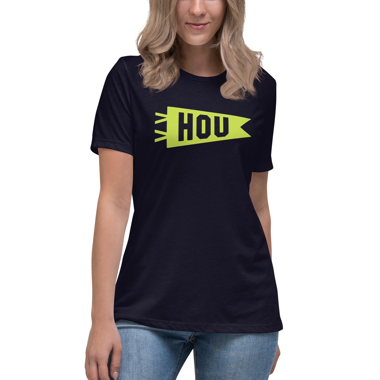 Elevate your look with this women's relaxed t-shirt featuring Houston, Texas's HOU (William P. Hobby) airport code in a vibrant green minimalist banner design. Beyond style, it embodies local pride and community spirit, making it more than just a shirt—it's a statement.