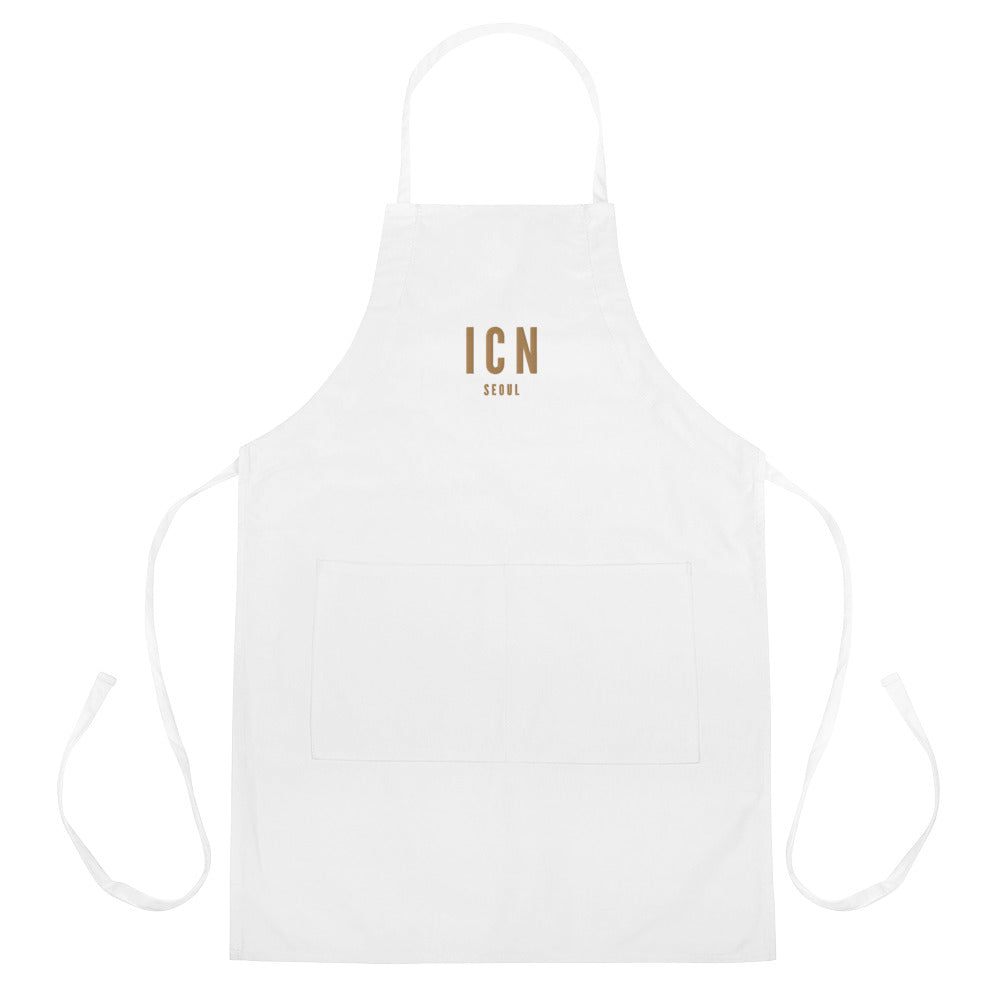 Elevate your culinary experience with this sophisticated apron featuring Seoul, South Korea's ICN (Incheon) airport code and city name elegantly embroidered in old gold thread.