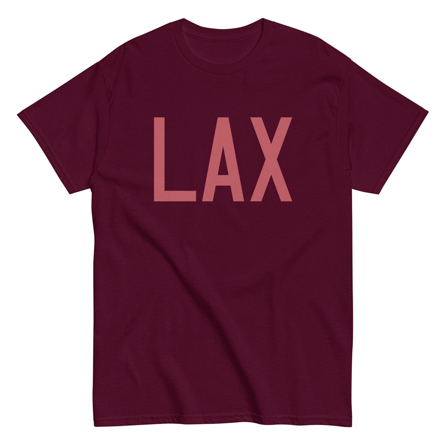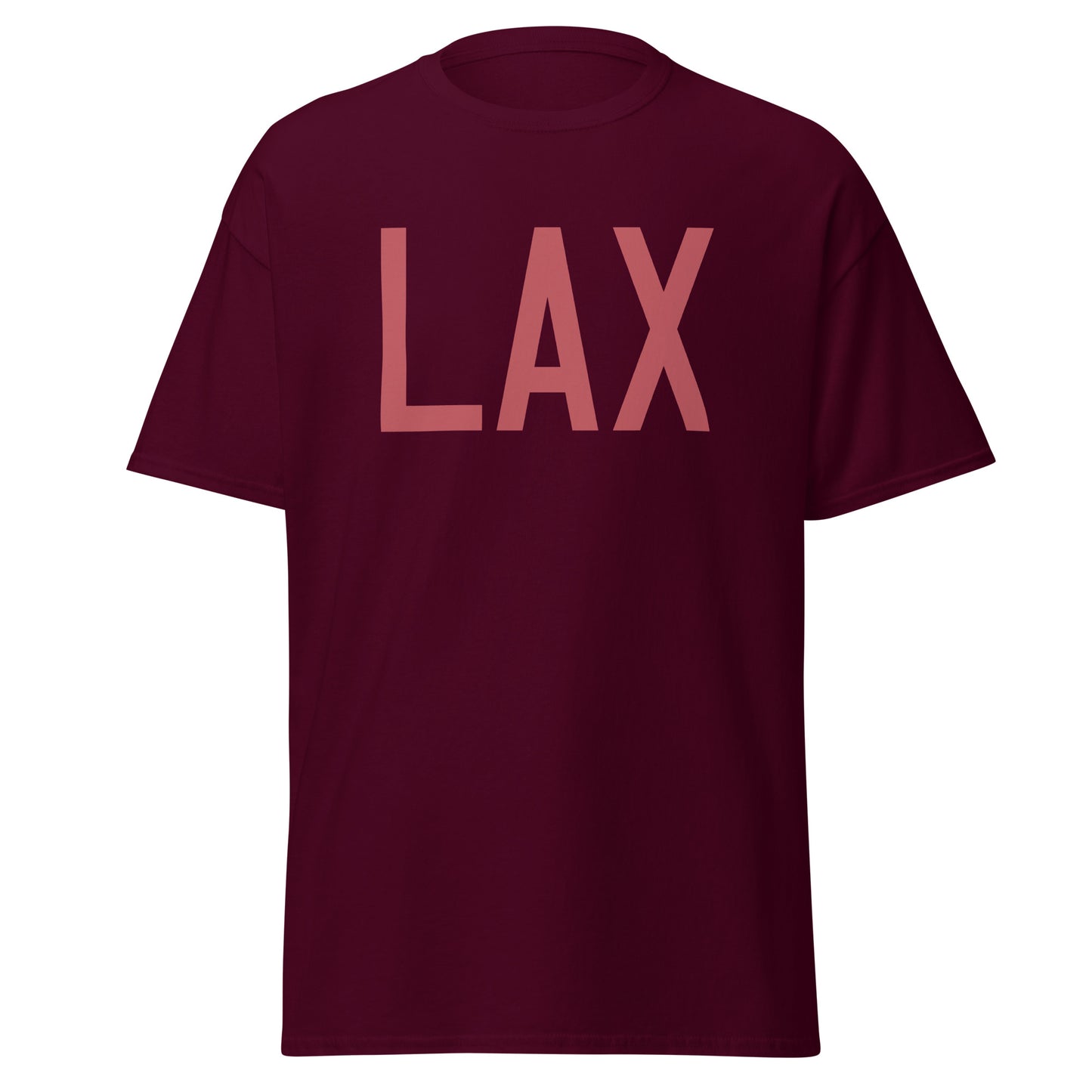 Celebrate your passion for aviation with our classic men's t-shirt featuring Los Angeles, California's LAX airport code. Embodied with the spirit of flight, this tee showcases the city's iconic airport code in captivating Air Force aircraft registration-inspired lettering in understated deep pink.