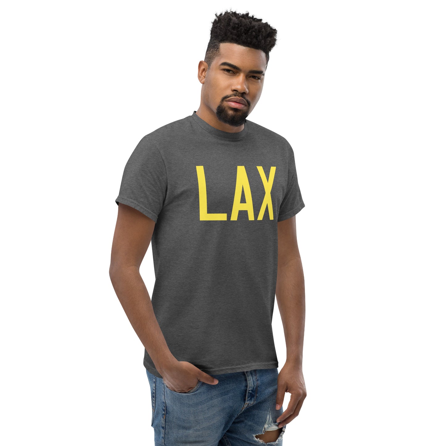 Celebrate your passion for aviation with our classic men's t-shirt featuring Los Angeles, California's LAX airport code. Embodied with the spirit of flight, this tee showcases the city's iconic airport code in captivating Air Force aircraft registration-inspired lettering in vibrant yellow.