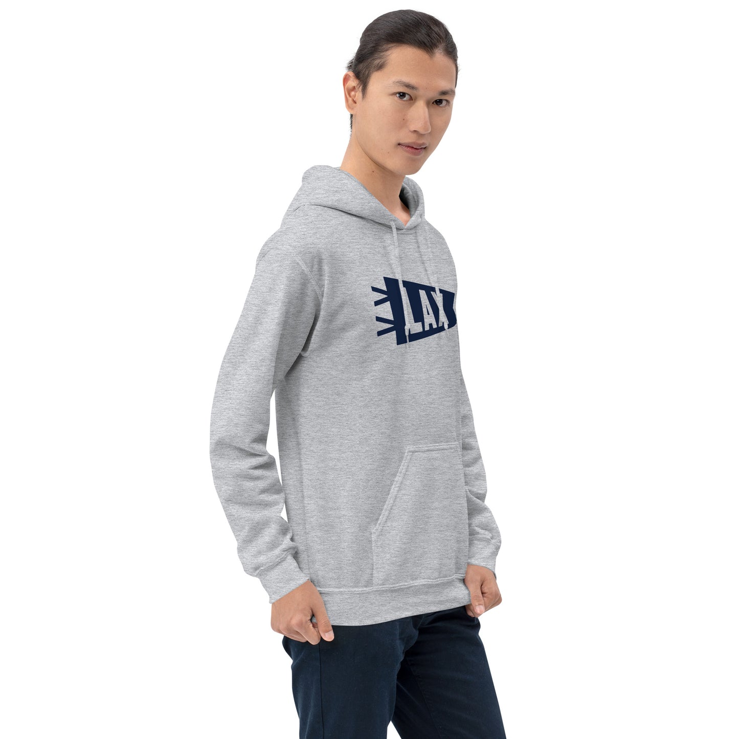 Embrace the perfect blend of comfort and pride with our unisex hoodie featuring Los Angeles, California's LAX airport code in a minimalist banner design printed in refined navy blue. Proudly represent your hometown or beloved city as you explore the urban landscape.