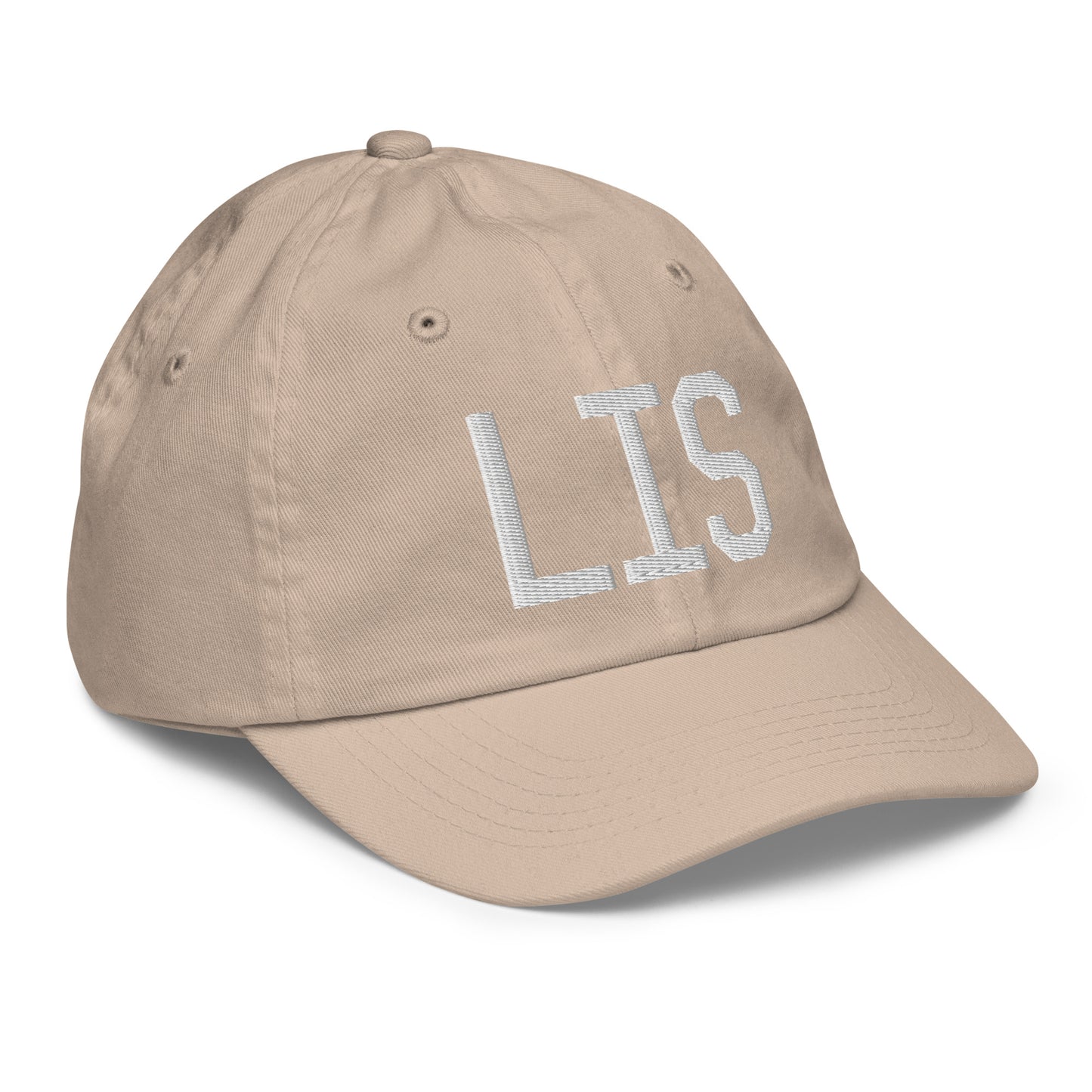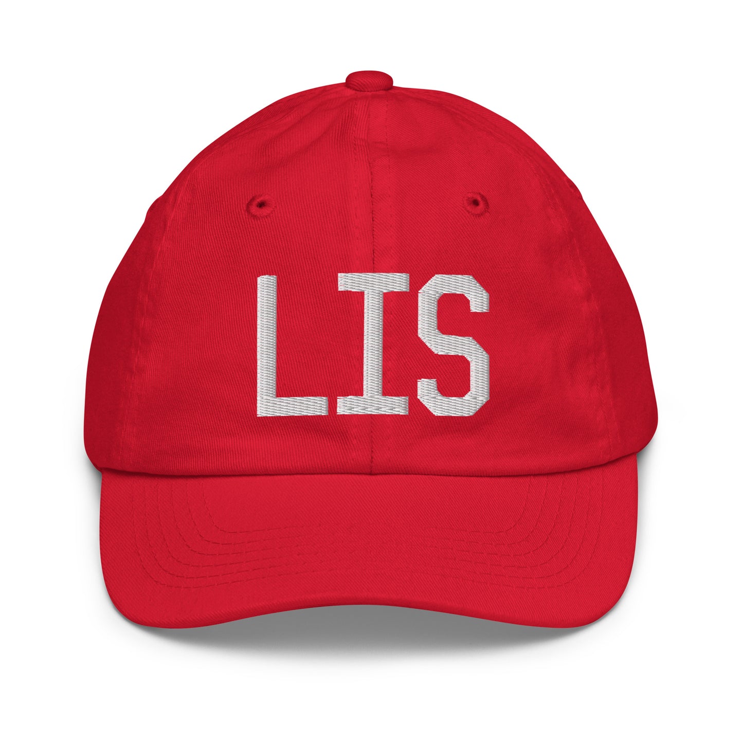 Elevate your child's style and imagination with our kid's baseball cap featuring Lisbon, Portugal's LIS (Humberto Delgado) airport code, intricately embroidered in classic white thread. Drawing inspiration from the aircraft registration lettering of the Air Force, the design captures the essence of aviation, making this cap a symbol of timeless flight.