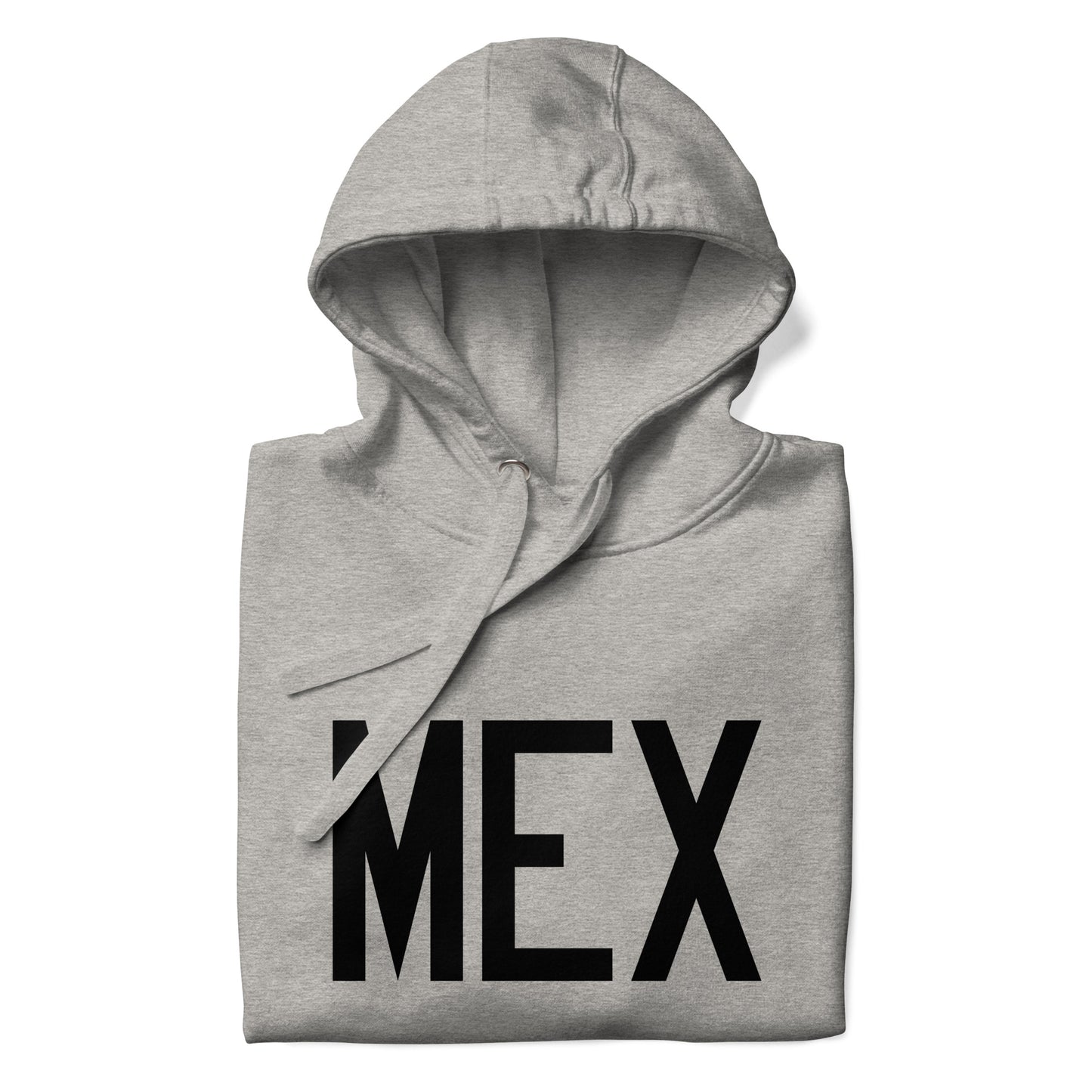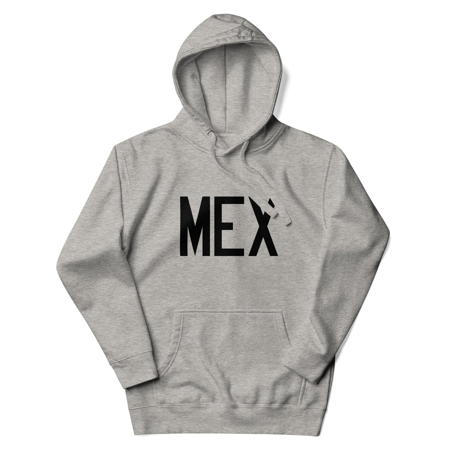 Fly high with our premium hoodie featuring Mexico City, Mexico's MEX (Benito Juarez) airport code. Inspired by aircraft registration numbers applied by the Air Force, the sleek lettering symbolizes your unbreakable connection to the world of aviation and the thrill of travel. The graphic, printed in striking black on the chest, adds an edgy touch to your look.