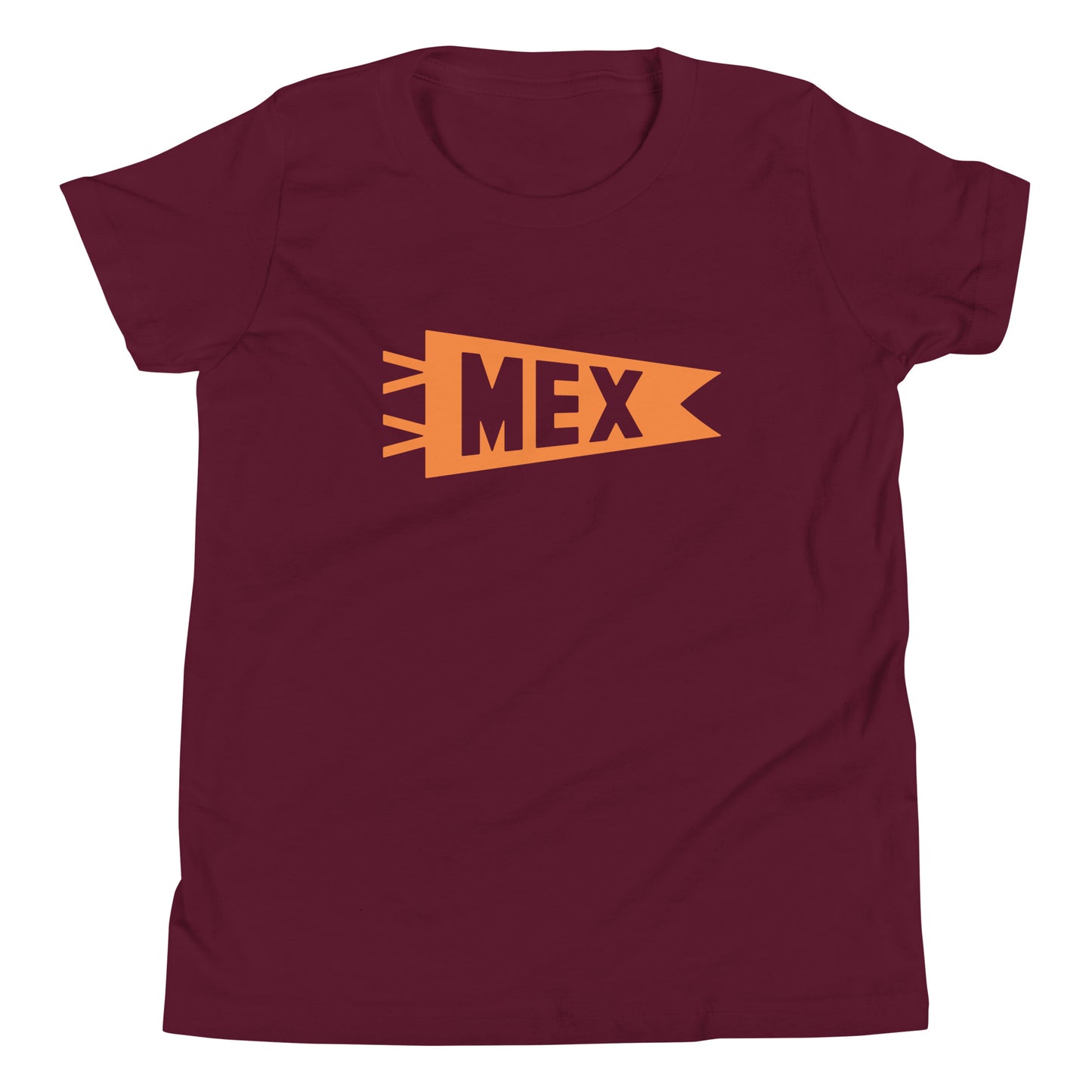 Equip your young adventurer with this kid's t-shirt featuring Mexico City, Mexico's MEX (Benito Juarez) airport code in a vibrant minimalist banner design. Printed in vivid orange, this tee is more than just apparel—it's a symbol of local pride, community spirit, and a burgeoning passion for travel.