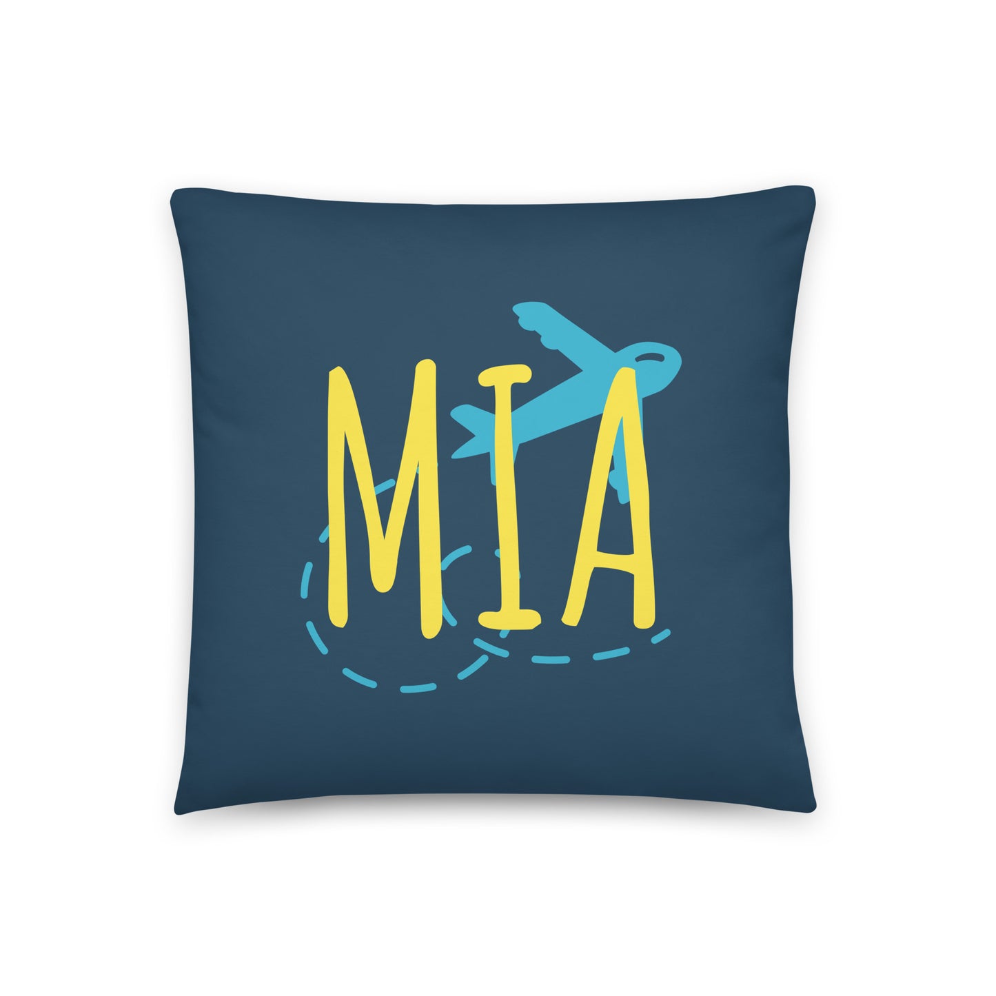 Introduce your little explorer to the wonders of the world with our charming throw pillow featuring Miami, Florida's MIA airport code in delightful hand-drawn lettering, accompanied by a playful airplane illustration. The vibrant combination of dark blue and bright yellow hues adds a splash of colour to any space, making it the perfect addition to a kid's travel-themed bedroom or a baby's airplane nursery.