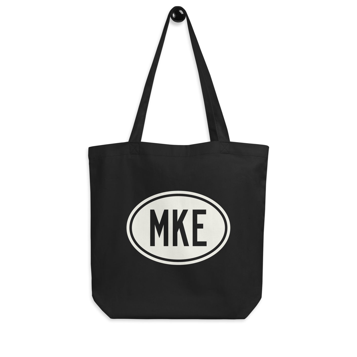 Elevate your daily routine with our organic cotton tote bag featuring Milwaukee, Wisconsin's MKE (General Mitchell) airport code — in a stylish nod to the classic oval car sticker once used to indicate a vehicle's country of registration. This design has evolved into an easily-recognizable cultural symbol of travel. It is elegantly printed in white on this black bag which serves as a bold backdrop.
