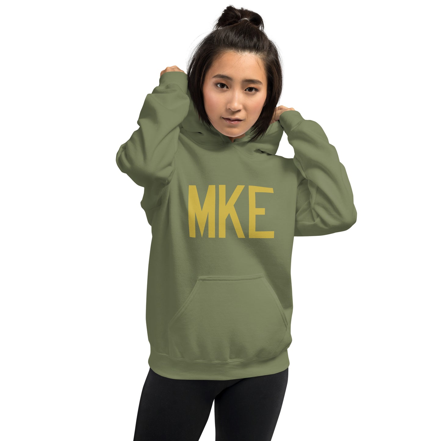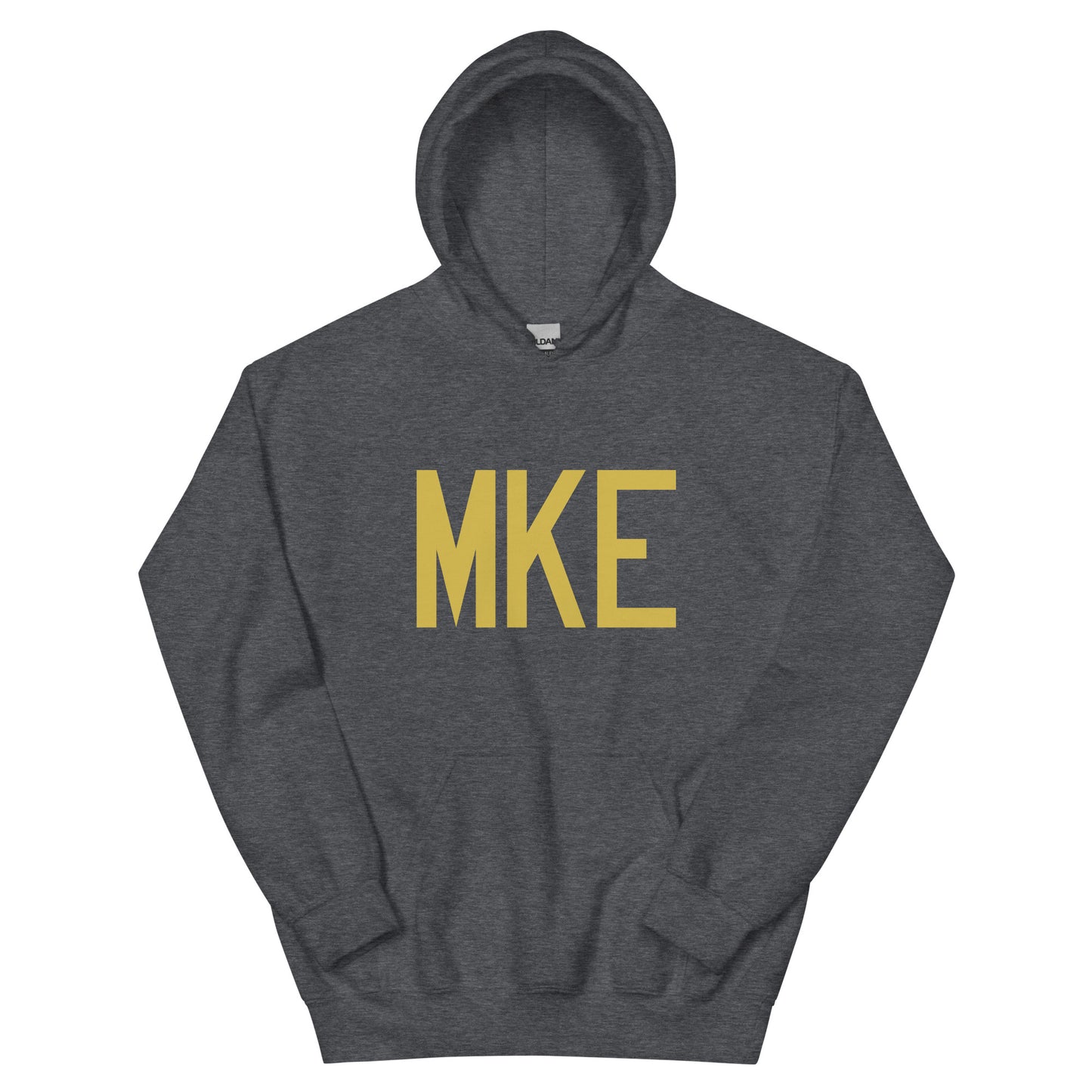Experience ultimate comfort and local pride with our hoodie featuring Milwaukee, Wisconsin's MKE (General Mitchell) airport code. The design is inspired by the lettering used by the Air Force for aircraft registration numbers. The graphic, presented in refined old gold, captures the very essence of flight.