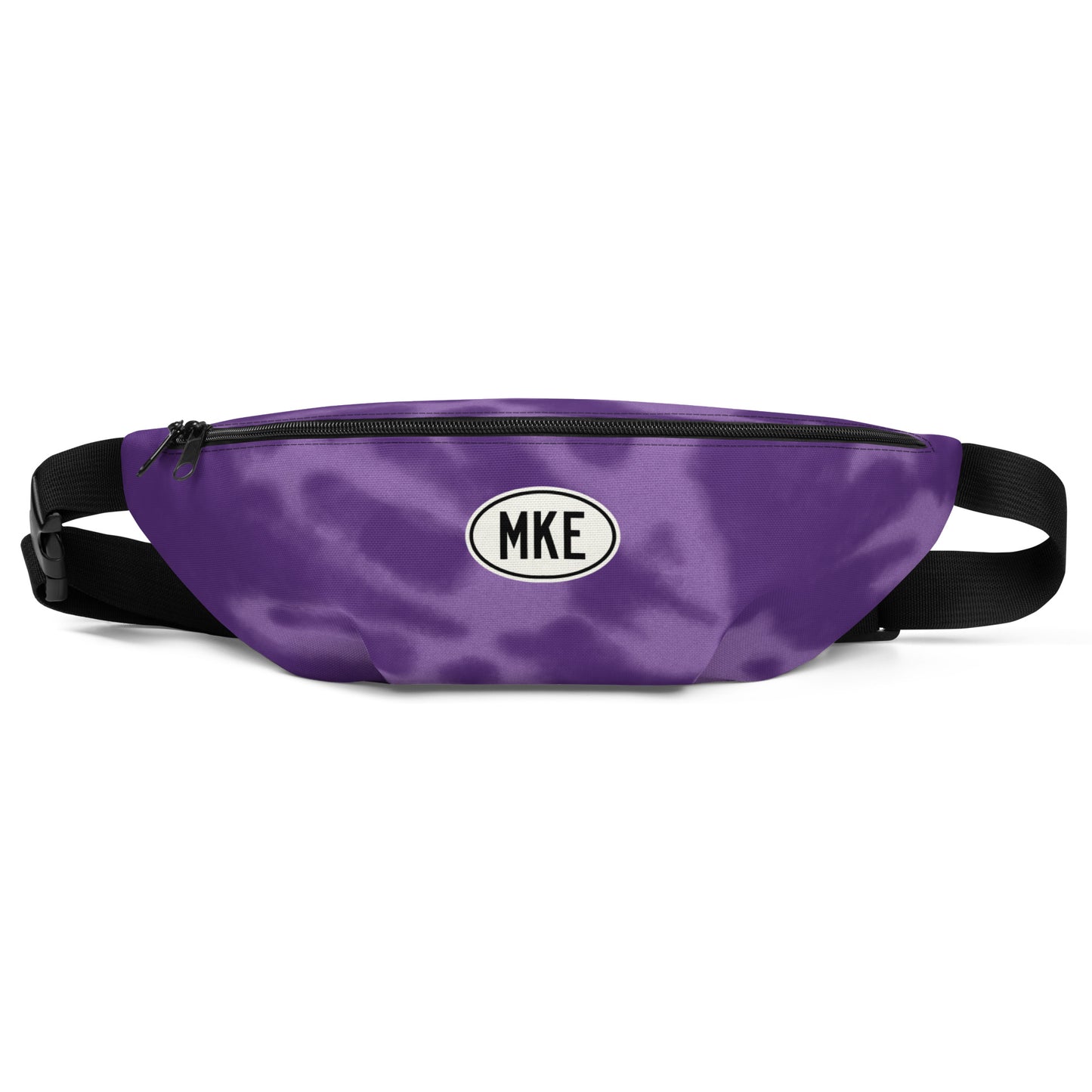 Elevate your on-the-go style with this fanny pack featuring Milwaukee, Wisconsin's MKE (General Mitchell) airport code. Inspired by vintage oval car stickers once affixed on vehicles to show their country of registration, this design adds a touch of travel culture with its vibrant purple tie-dye background.