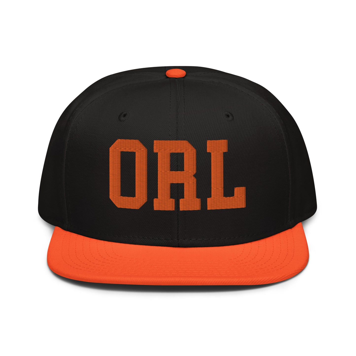 Elevate your streetwear with our black and orange snapback hat featuring Orlando, Florida's ORL (Executive) airport code, boldly embroidered in vintage college-style lettering. This throwback varsity-inspired design adds a timeless edge to any outfit, with orange embroidery perfectly complementing the hat's colour scheme. The firm front panel, flat visor, and full buckram help maintain its classic shape, offering both durability and style.