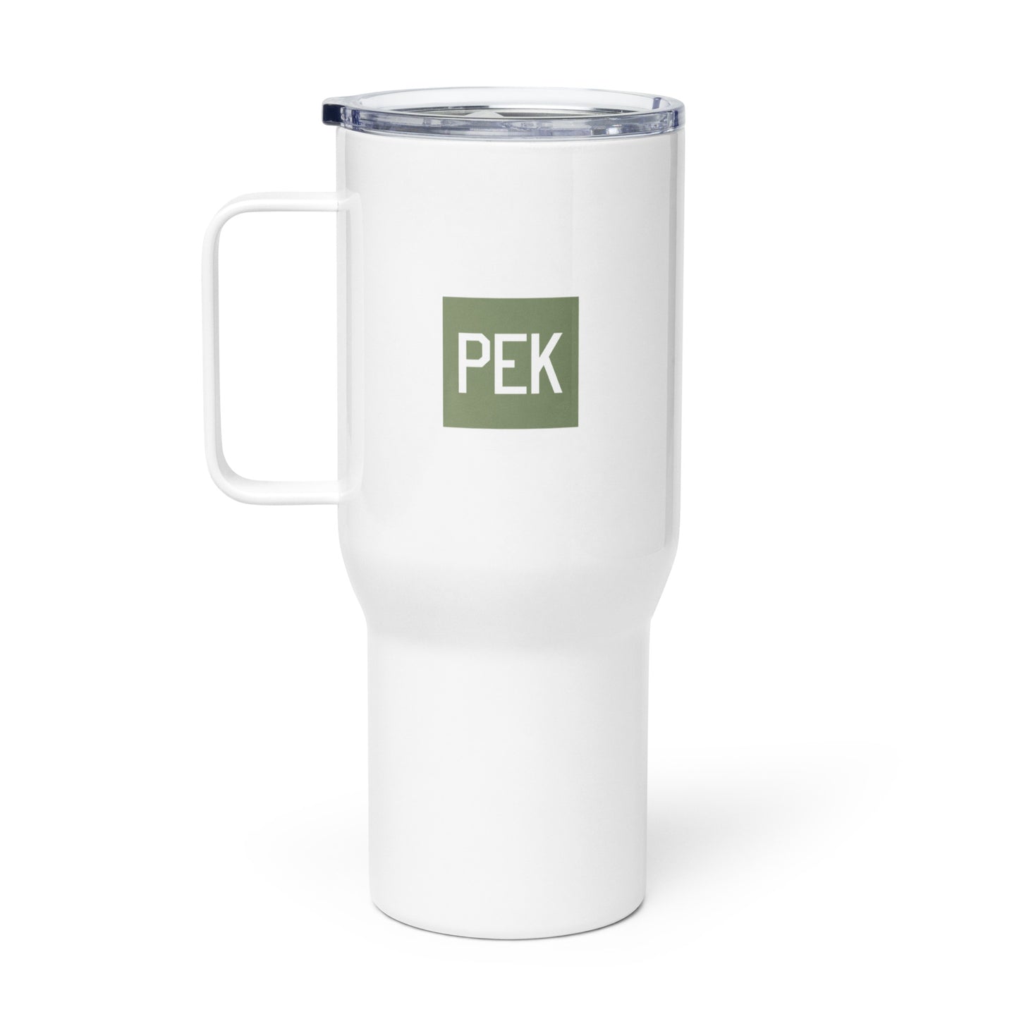 Get this travel mug featuring Beijing, China's PEK (Capital) airport code in lettering reminiscent of Air Force registration numbers, adding an aviation-inspired touch with every sip. The design is printed in subdued camouflage green on both sides creating a minimalist and functional aesthetic. Whether you're at home, in the office, or on the go, this mug allows you to proudly represent your hometown, favourite city, or dream travel destination.