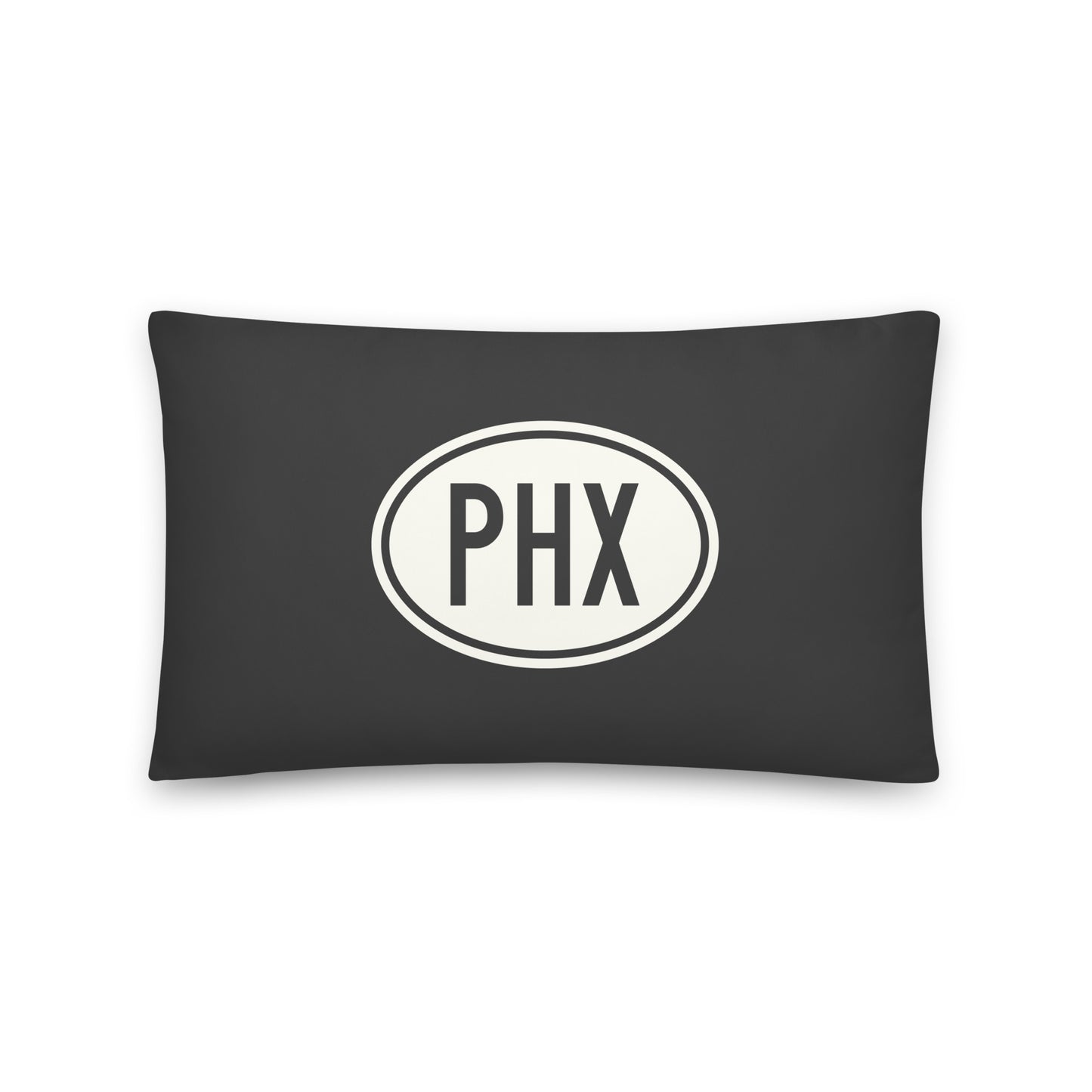 Transform your living space with this rectangular throw pillow featuring Phoenix, Arizona's PHX (Sky Harbor) airport code in a vintage oval car sticker design. The white graphic pops against an elegant eclipse grey background, adding a touch of travel culture to your home decor. Celebrate your hometown, favourite city, or a cherished travel destination while accenting your sofa or bed with this travel-themed piece.