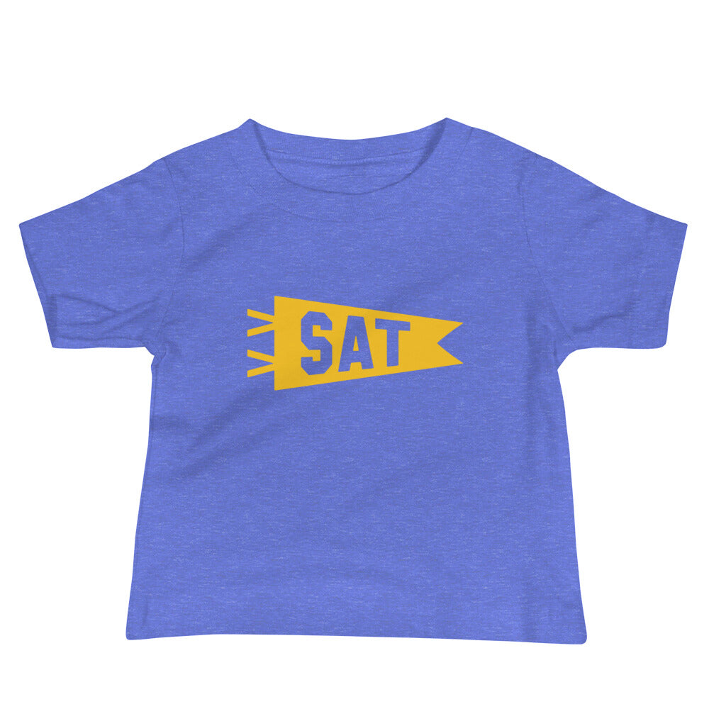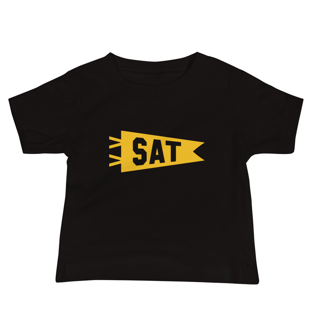 Snag this whimsical baby t-shirt featuring San Antonio, Texas's SAT airport code, adorned with a vibrant yellow minimalist banner design, symbolizing local pride and community spirit. Whether your little explorers are romping in the park, discovering town, or nestled in the crib, this cheerful shirt adds a stylish touch to their wardrobe. Ideal for both boys and girls, it's more than clothing—it's a playful statement of hometown pride.