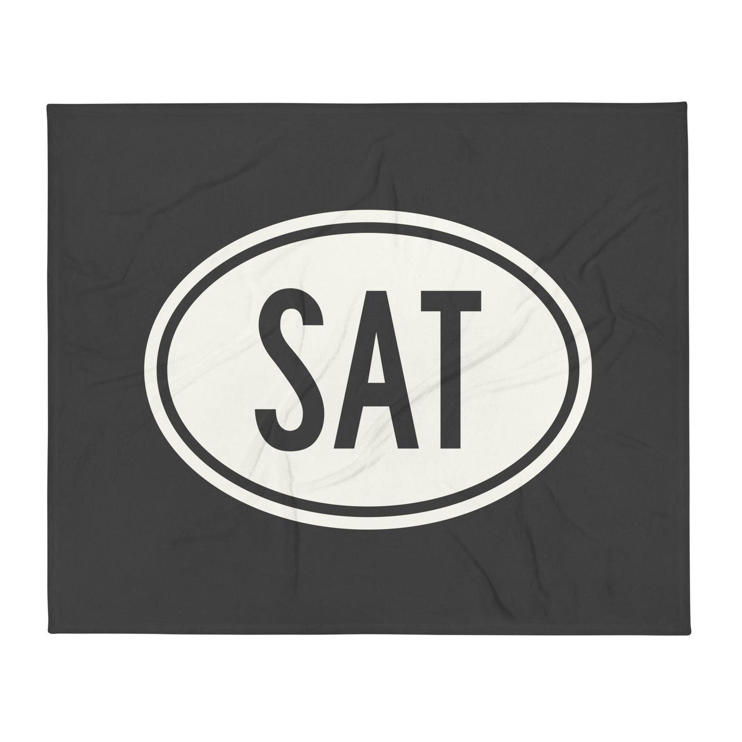 Elevate your home decor and cozy up in style with this chic throw blanket featuring San Antonio, Texas's SAT airport code in a vintage oval car sticker design. Against an elegant eclipse grey background, the white graphic adds a touch of travel culture to your living space. The front side showcases the iconic oval car sticker, while the reverse is a clean white, offering versatility and sophistication.