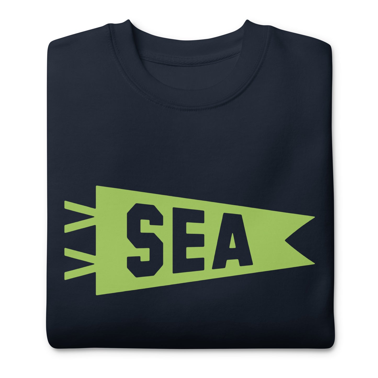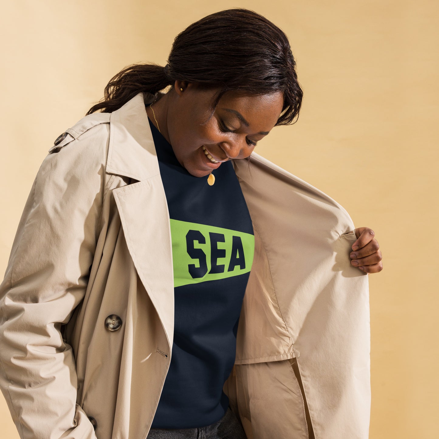 Experience ultimate comfort and express your pride with our premium sweatshirt featuring Seattle, Washington's SEA airport code in a minimalist banner design printed in eye-catching green. Confidently represent your hometown or beloved city as you explore the urban landscape.