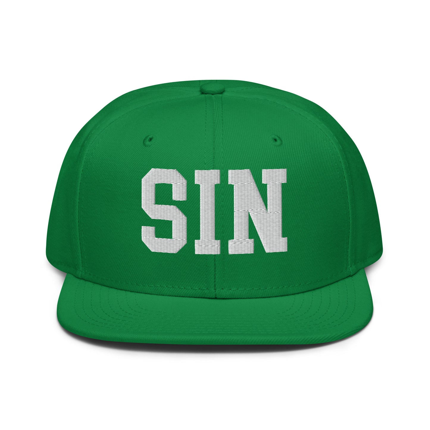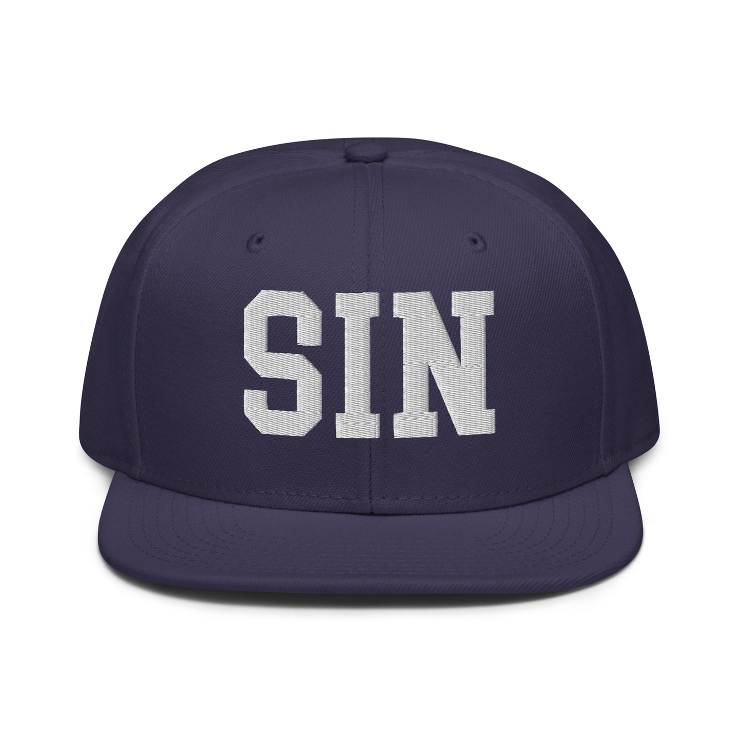 Elevate your streetwear with our wool-blend snapback hat featuring Singapore's SIN (Changi) airport code, boldly embroidered in vintage college-style lettering. This throwback varsity-inspired design adds a timeless edge to any outfit, with white embroidery perfectly complementing the hat's colours. The firm front panel, flat visor, and full buckram help maintain its classic shape, offering both durability and style.
