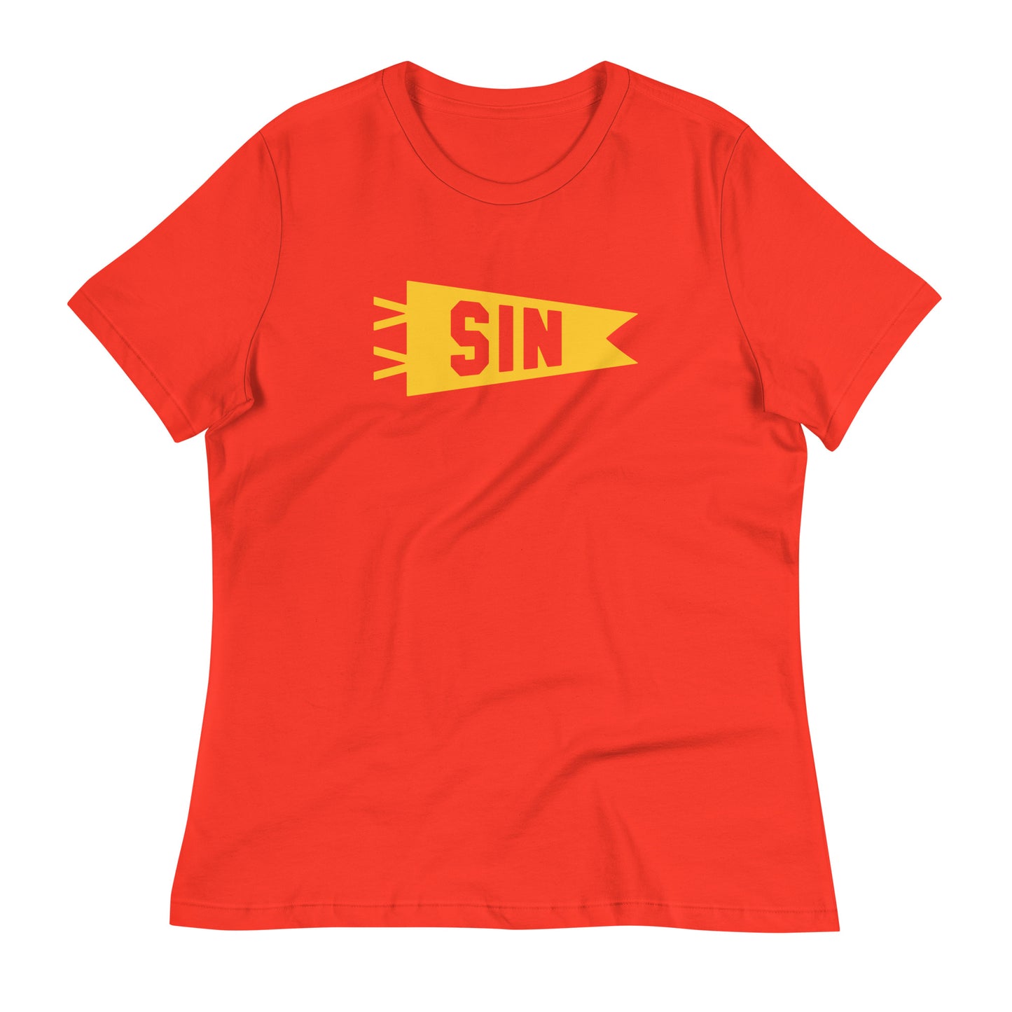 Elevate your look with this women's relaxed t-shirt featuring Singapore's SIN (Changi) airport code in a vivid yellow minimalist banner design. Beyond style, it embodies local pride and community spirit, making it more than just a shirt—it's a statement.