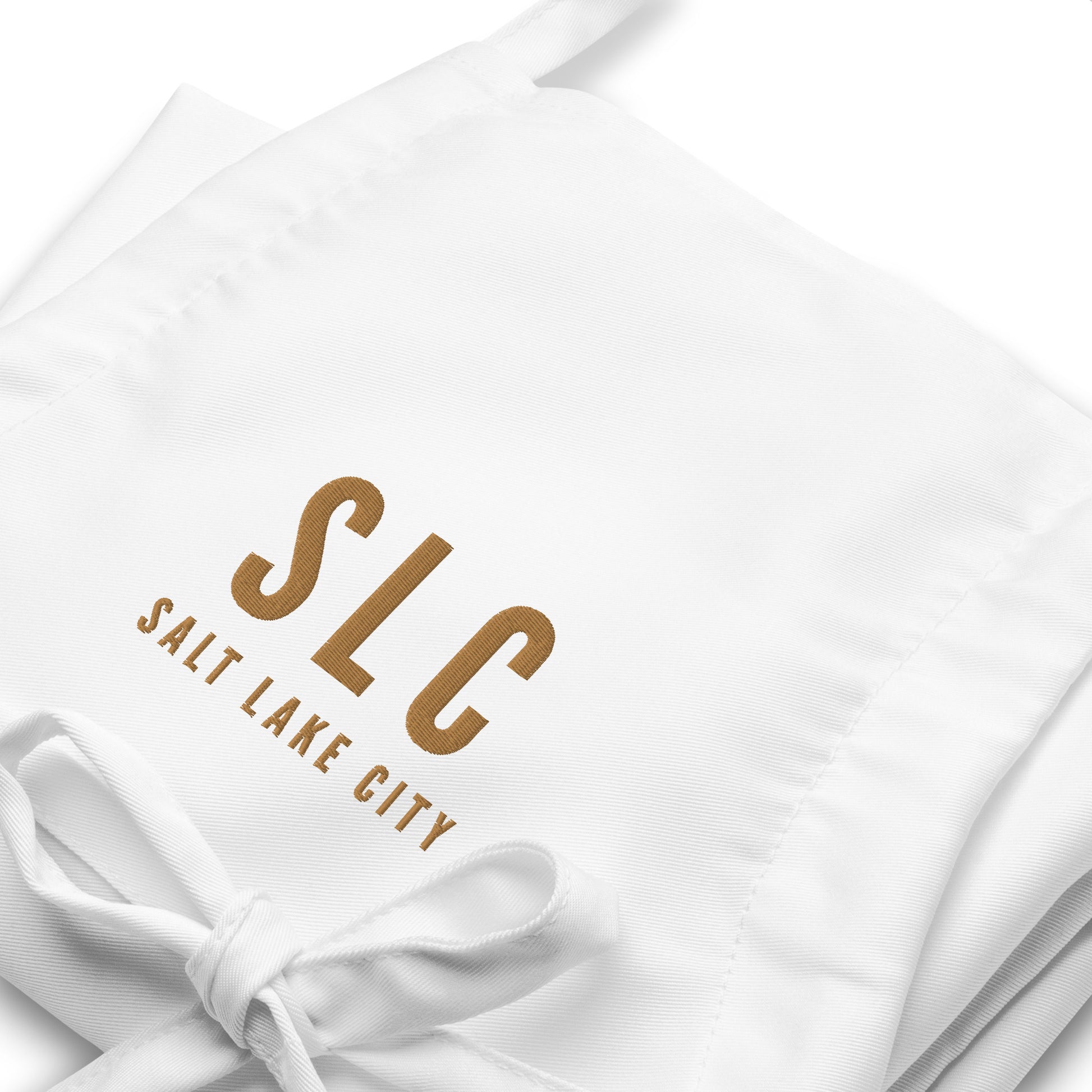 Elevate your culinary experience with this sophisticated apron featuring Salt Lake City, Utah's SLC airport code and city name elegantly embroidered in old gold thread.