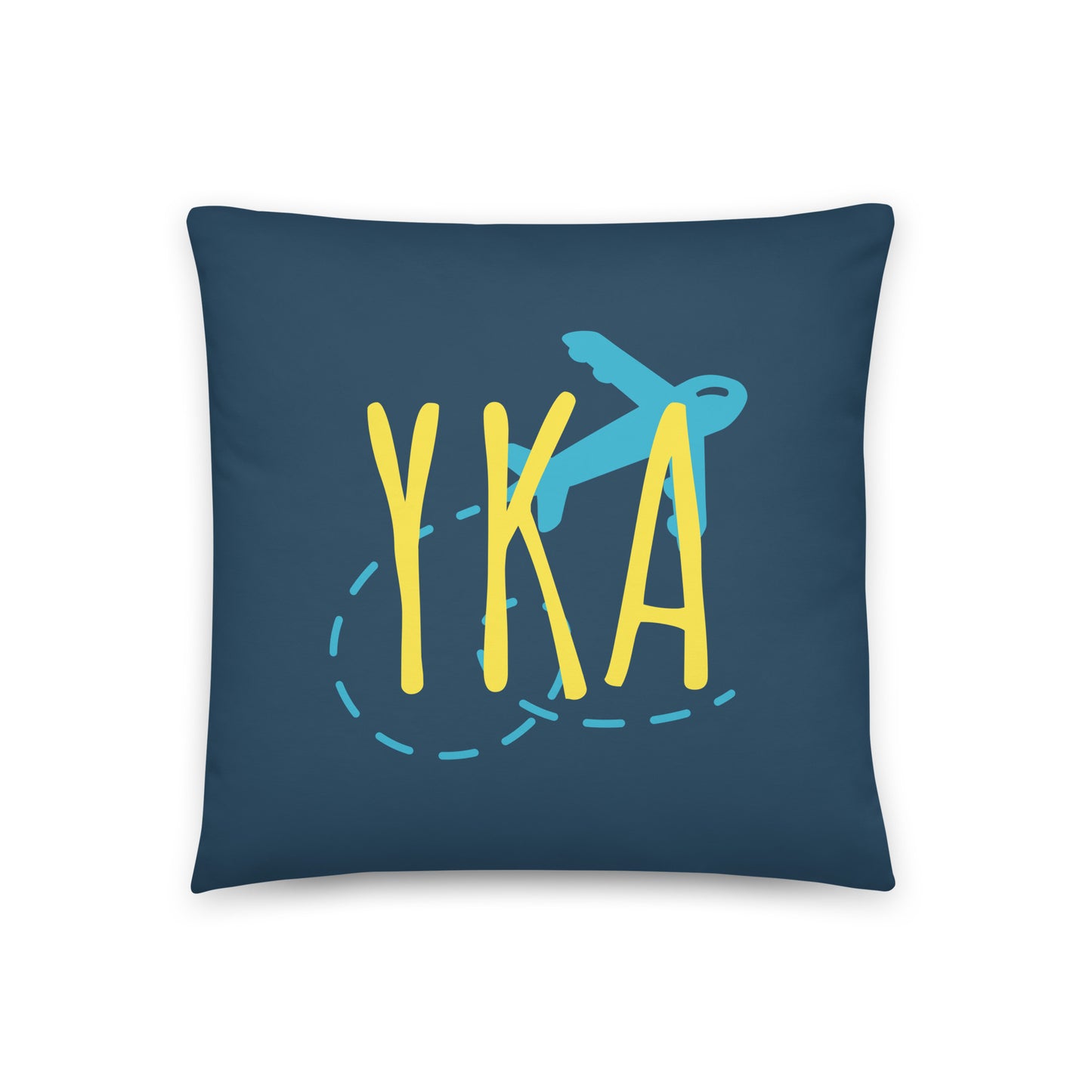 Introduce your little explorer to the wonders of the world with our charming throw pillow featuring Kamloops, British Columbia's YKA airport code in delightful hand-drawn lettering, accompanied by a playful airplane illustration. The vibrant combination of dark blue and bright yellow hues adds a splash of colour to any space, making it the perfect addition to a kid's travel-themed bedroom or a baby's airplane nursery.