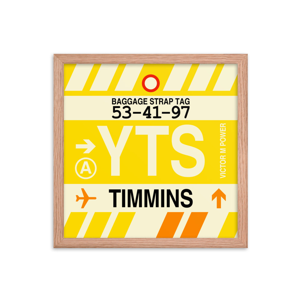 Immerse yourself in the timeless allure of this framed poster featuring Timmins, Ontario's YTS (Victor M. Power) airport code. This souvenir print is designed to evoke the vintage charm of a classic baggage tag. It effortlessly transports you to the golden age of air travel, where every journey was infused with the glamour and romance of the jetset lifestyle. The colour palette draws inspiration from iconic airline liveries, adding an authentic touch that brings the past to life.