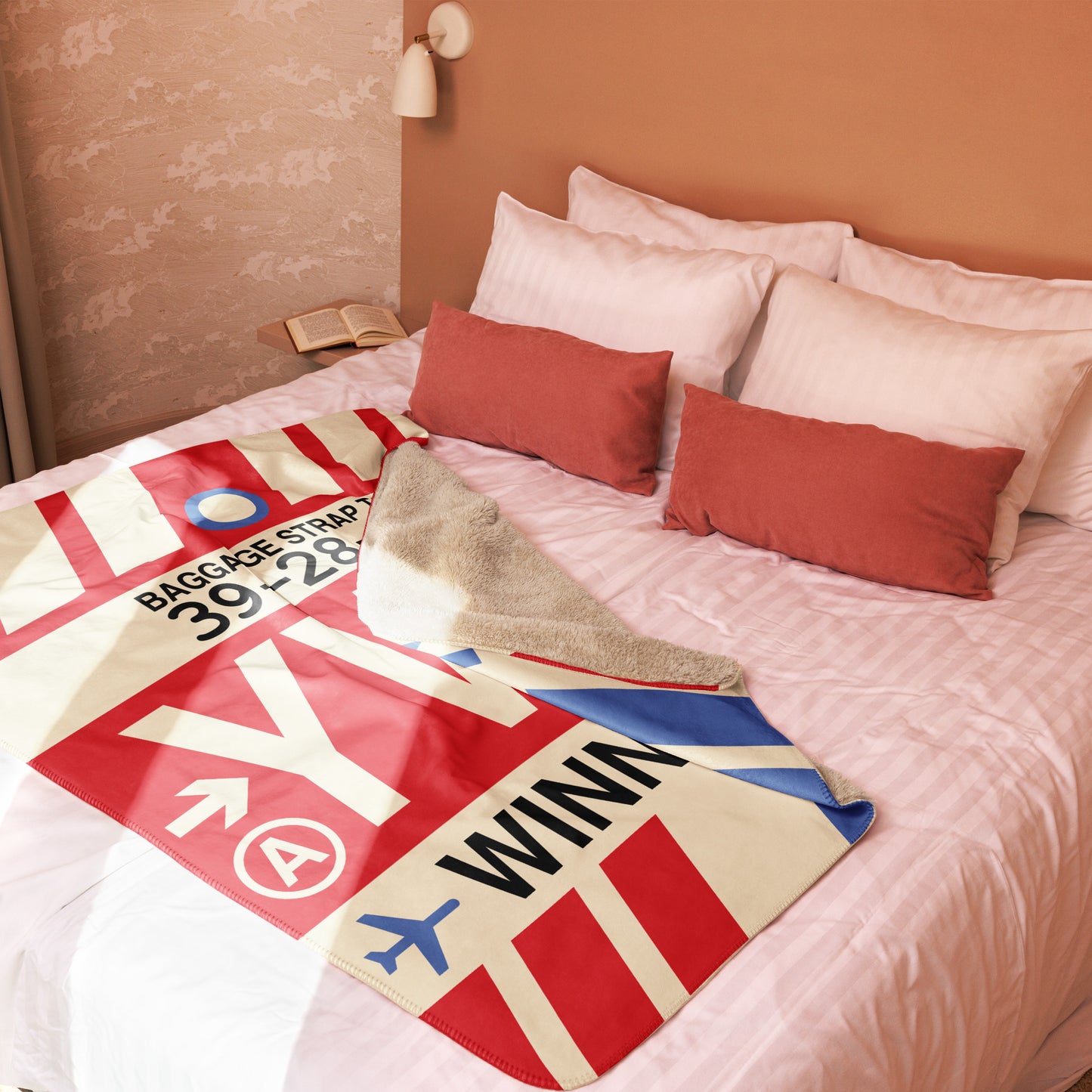 Wrap yourself in the nostalgia of air travel's golden era with this souvenir sherpa throw blanket featuring Winnipeg, Manitoba's YWG (James Armstrong Richardson) airport code and city name in a vintage baggage tag design. Drawing inspiration from the glamour and luxury of the jet age, the colours echo classic airline liveries, adding an authentic touch that elevates your home decor.