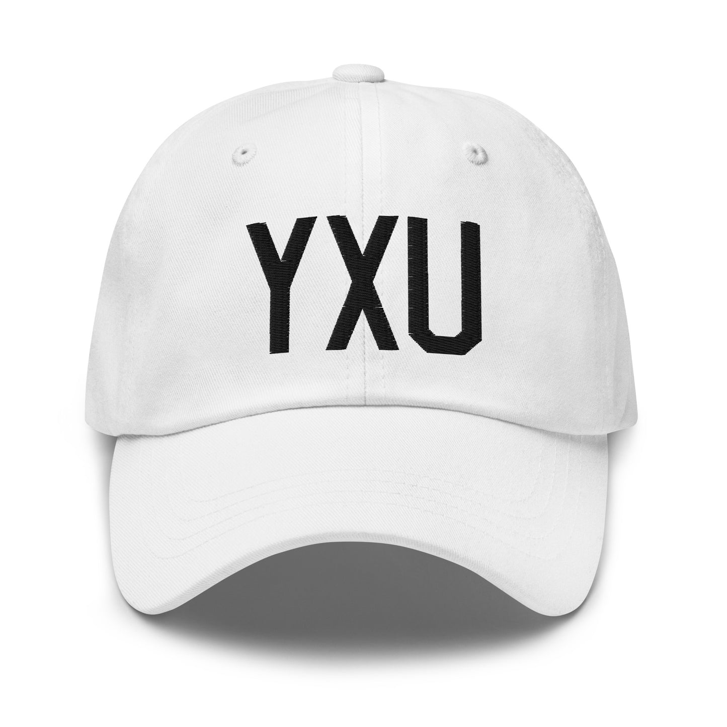 Embrace the spirit of aviation with our timeless baseball cap featuring London, Ontario's YXU airport code – a testament to pride and connection. Embroidered in edgy black, this cap's lettering is inspired by the Air Force's aircraft registration numbers, artfully embodying the world of flight.