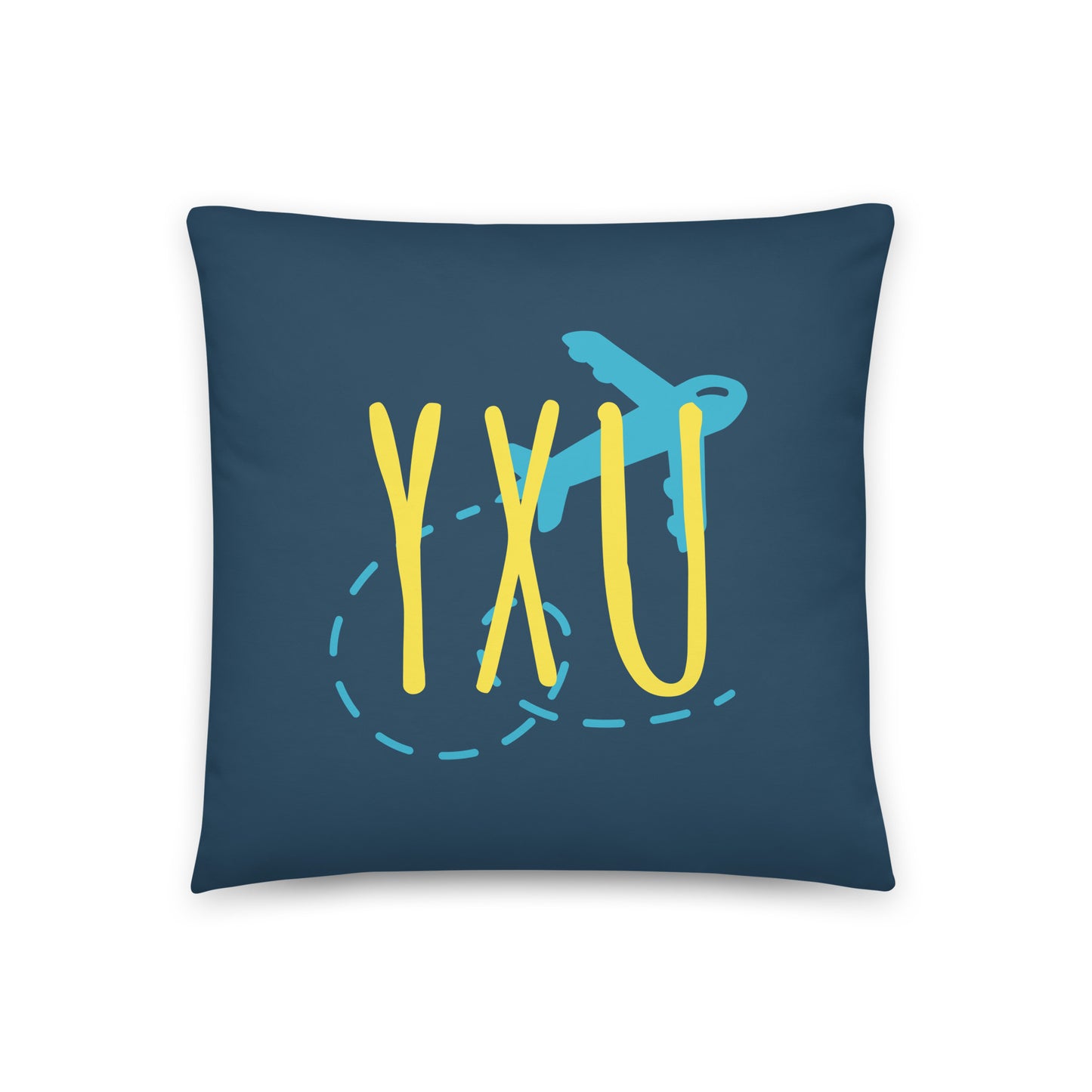 Introduce your little explorer to the wonders of the world with our charming throw pillow featuring London, Ontario's YXU airport code in delightful hand-drawn lettering, accompanied by a playful airplane illustration. The vibrant combination of dark blue and bright yellow hues adds a splash of colour to any space, making it the perfect addition to a kid's travel-themed bedroom or a baby's airplane nursery.